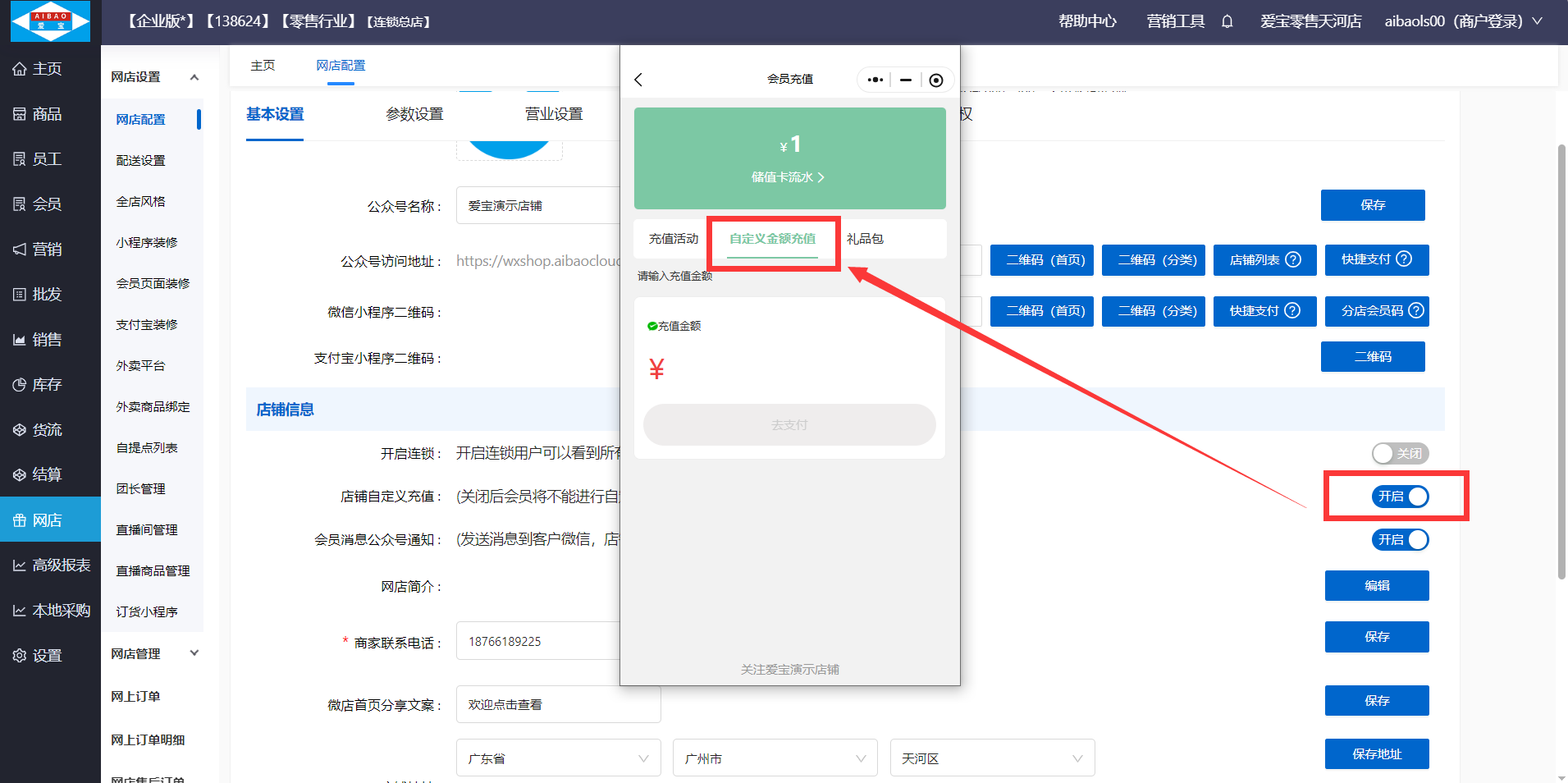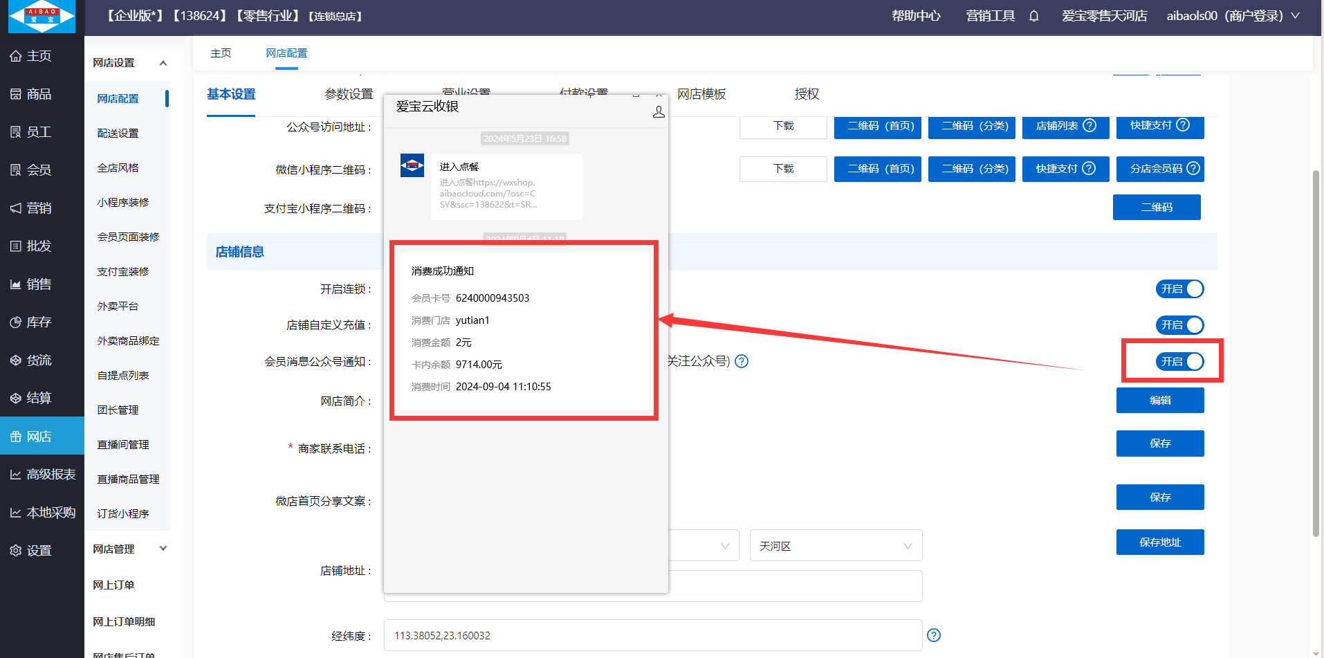 开启后,发送消息到客户微信,店铺需要开通微店,会员必须关注公众号