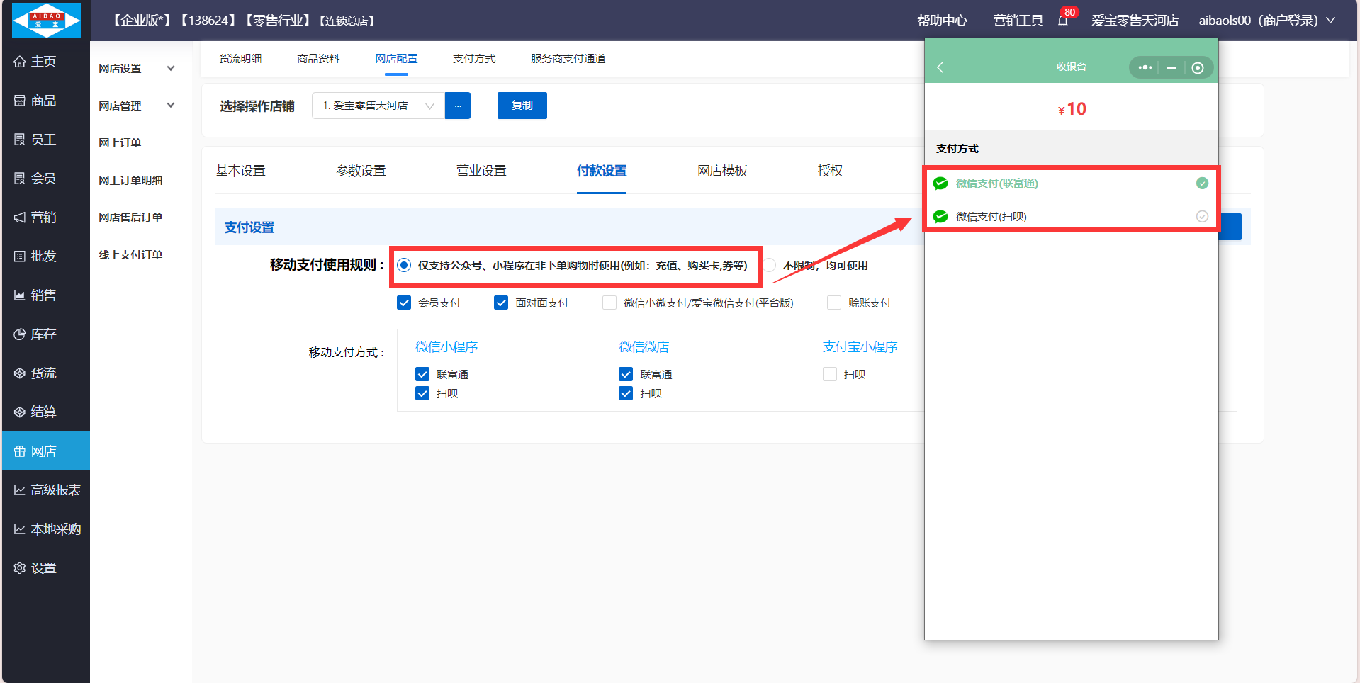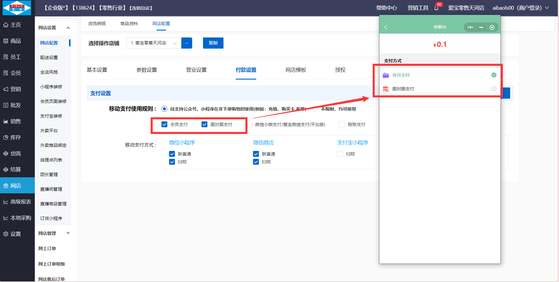 路径:【网店】-【网店设置】-【网店配置】-【付款设置】