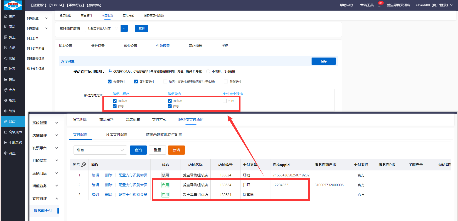 服务商支付通道配置后,小程序才会显示移动支付信息,并可以设置微信小程序、微店、支付宝小程序使用哪种支付信息
