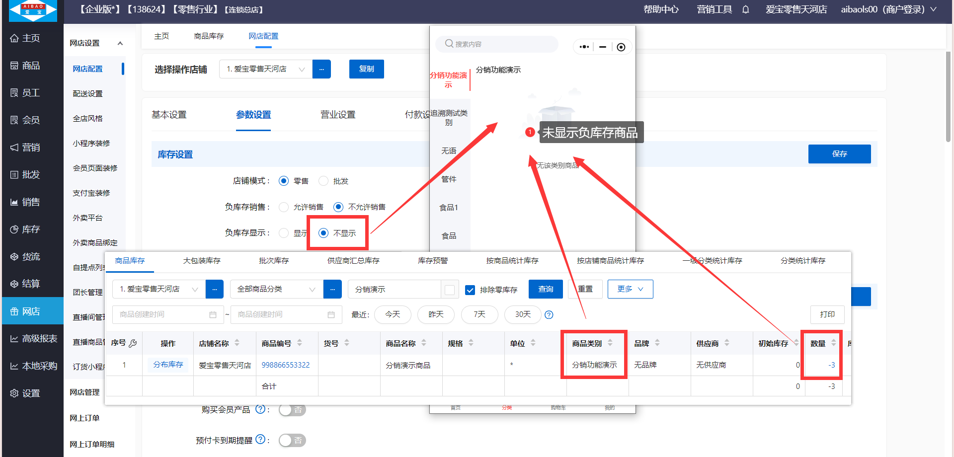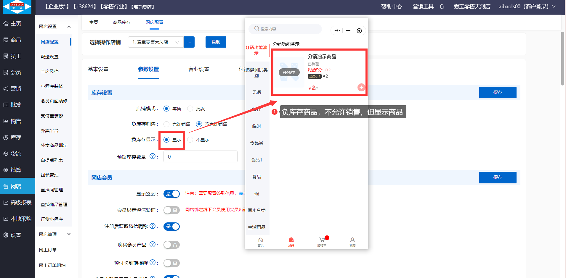 负库存显示:选择显示,负库存的商品在小程序可以查看