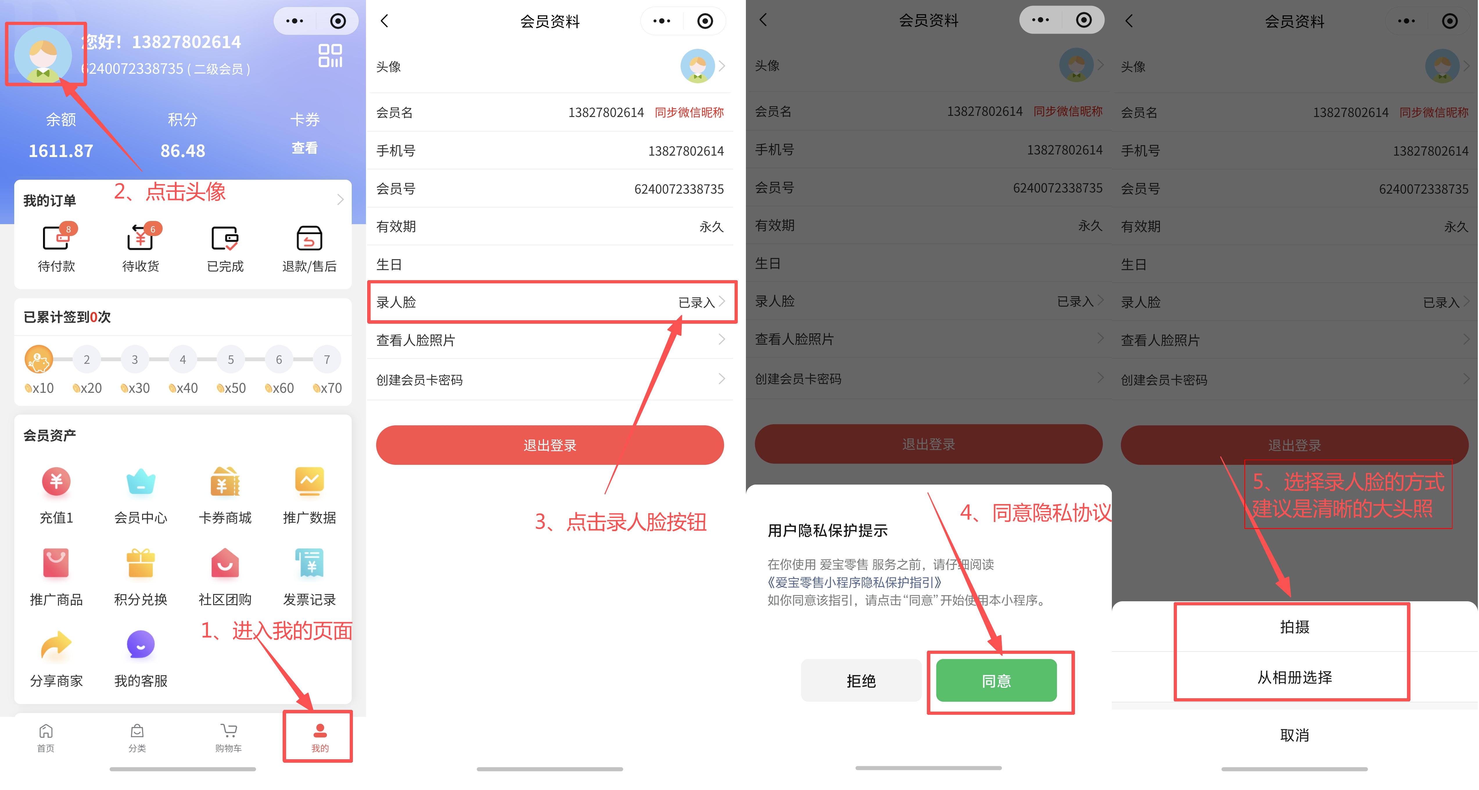 2.登录小程序,①点击我的→②点击头像→③点击人脸→④选择上传图片方式(建议选择清晰的大头照,否则识别人脸容易失败)(图2)。