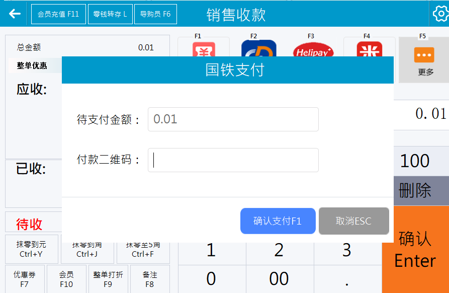 5.前台收款,选用【国铁支付】支付,测试是否正常支付