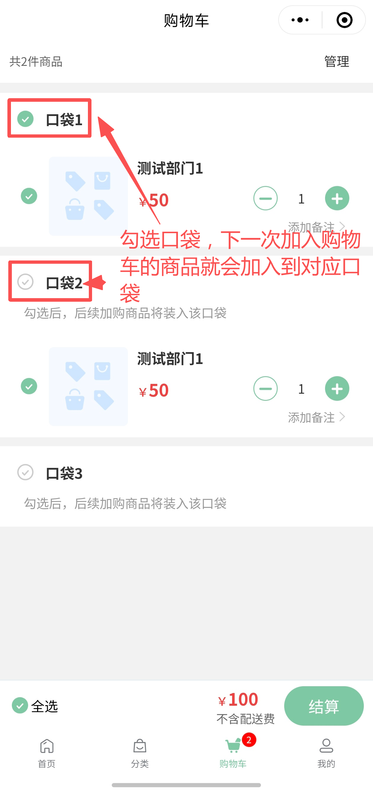 2.登录小程序,选择商品加入购物车,打开购物车页面,即可看到有多口袋可以勾选,勾选口袋1,则下次商品加入口袋1,选择口袋2,则下次商品加入口袋2,如(图2);