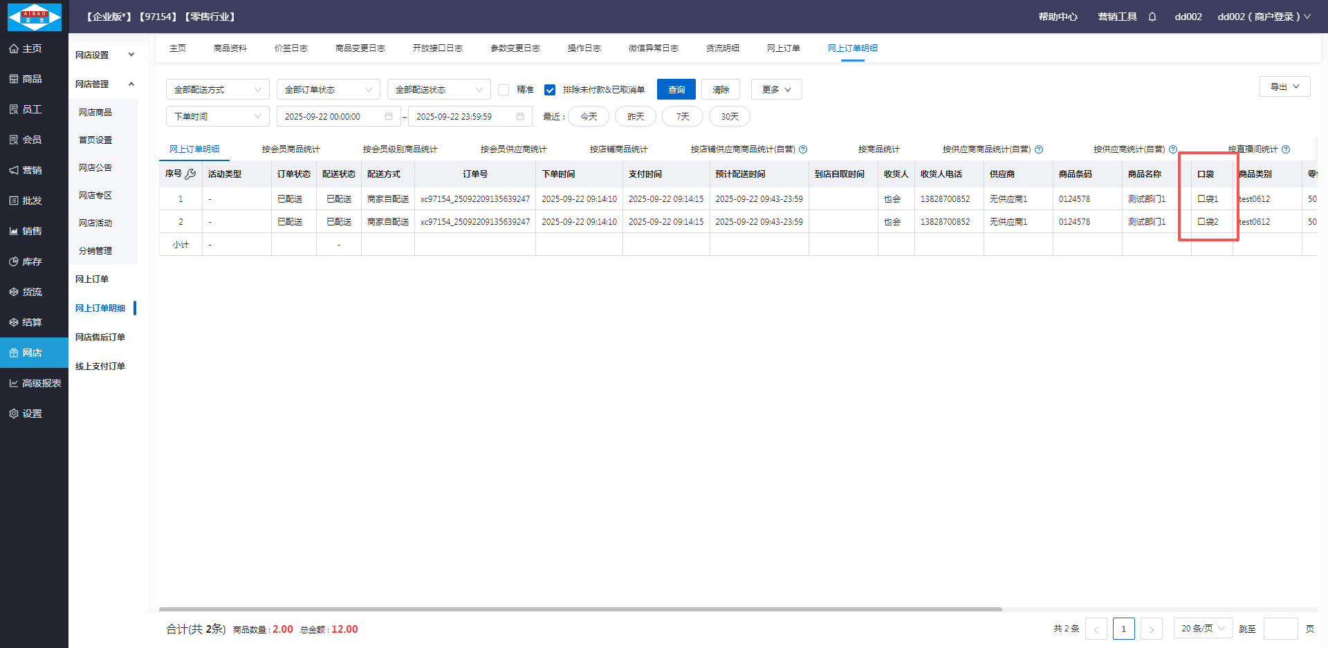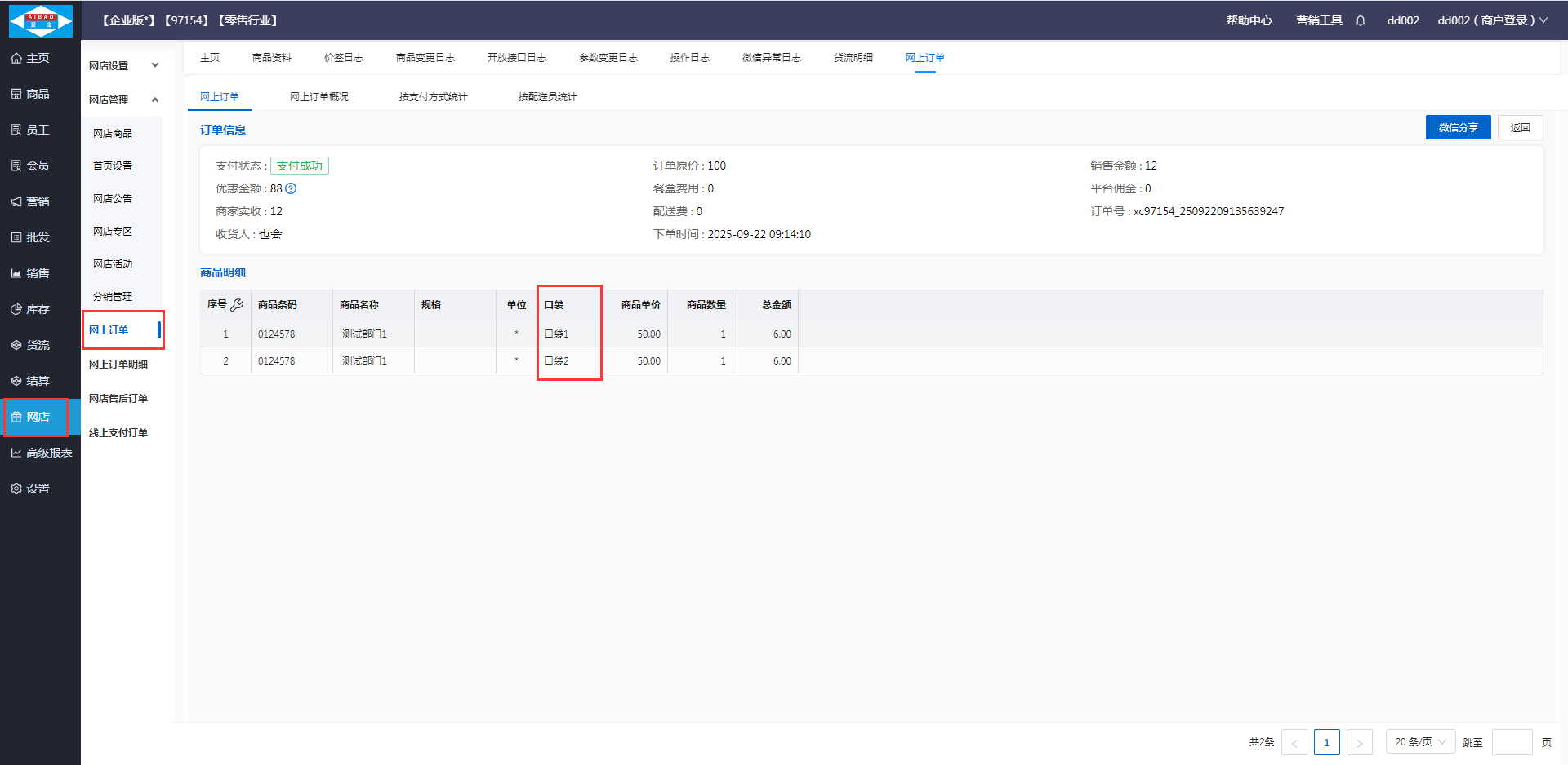 4.打开【网店】-【网上订单明细】,查看口袋,可以看到商品的口袋信息(图4);