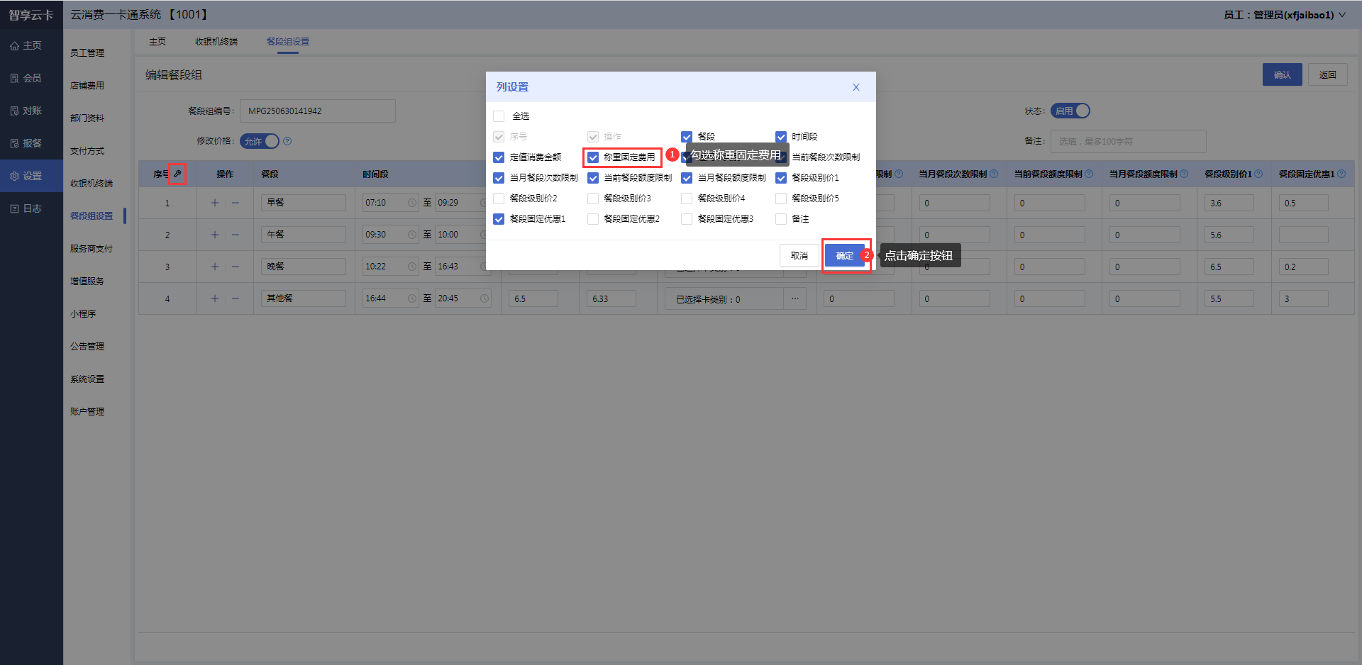 2.2.2设置称重固定费用,打开设置-餐段组设置,选择收银机终端已经选择的餐段组编辑,点击序号旁边的自定义列按钮,勾选称重固定费用列,点击确定(图4),输入称重固定费用。