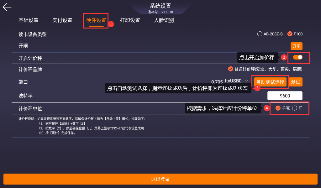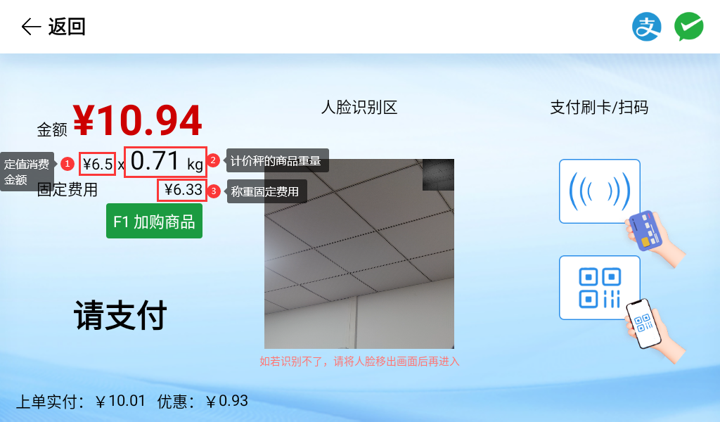 注:消费机版本需要升级到V1.1.78;计价秤只支持爱宝、大华、顶尖、瑞箭的普通计价秤;收银机终端需要开启餐段模式才能使用到计价秤。