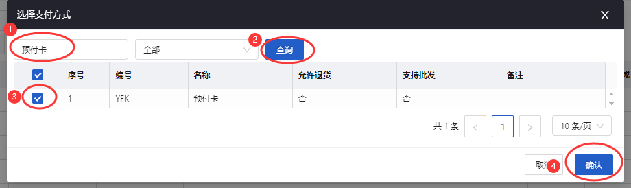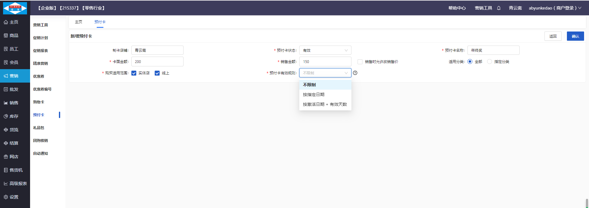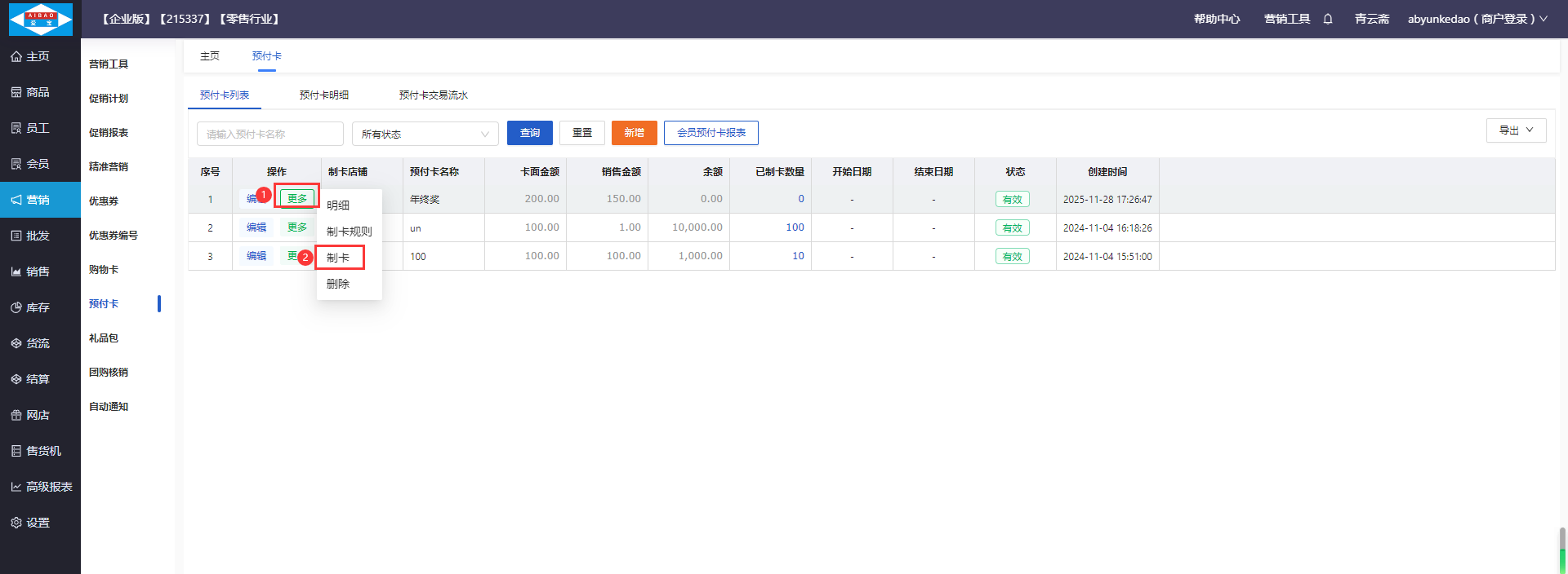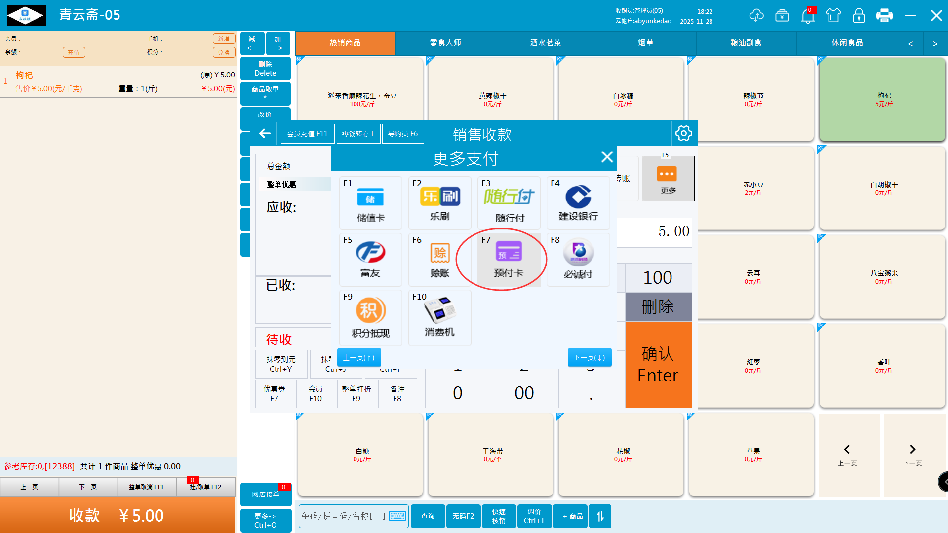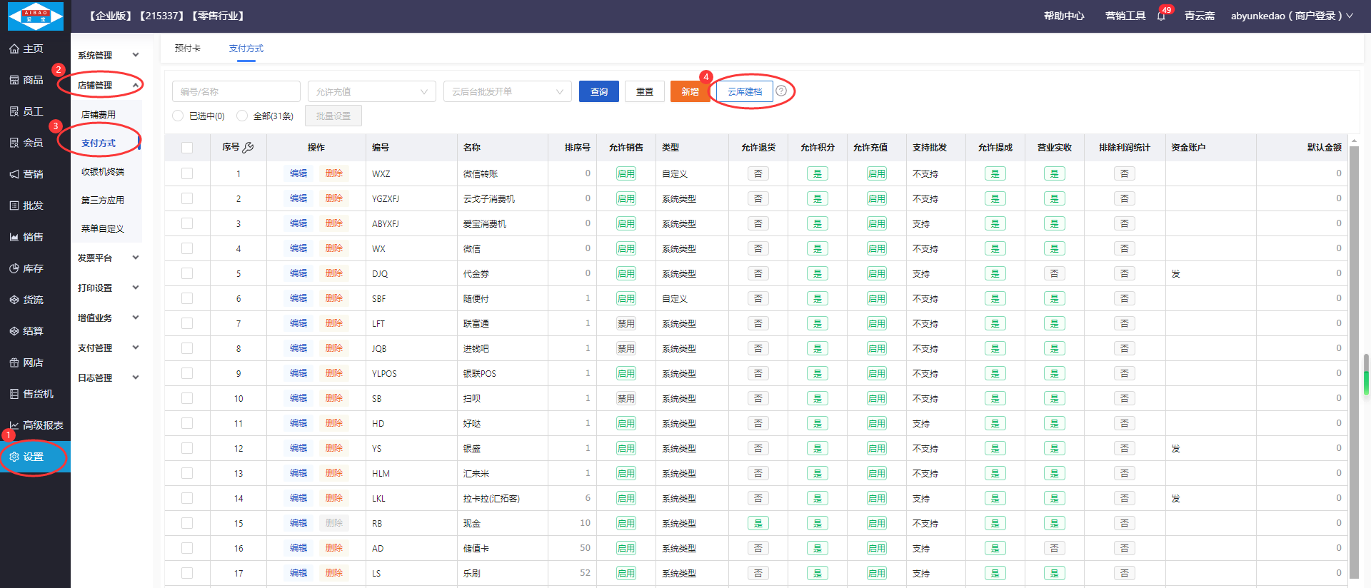 1.云后台->【设置】->【店铺管理】->【支付方式】->【云库建档】,启用预付卡付款方式。