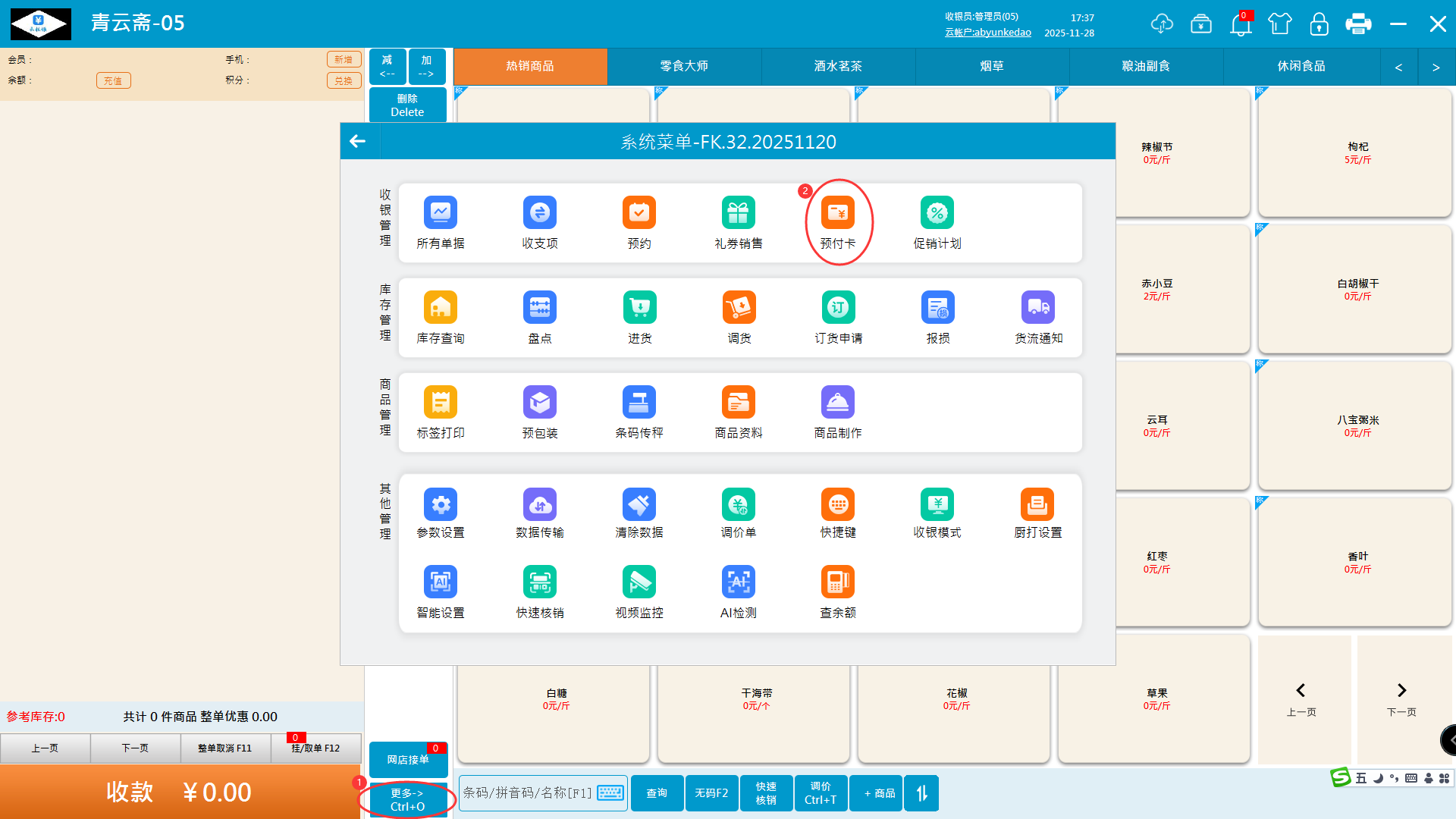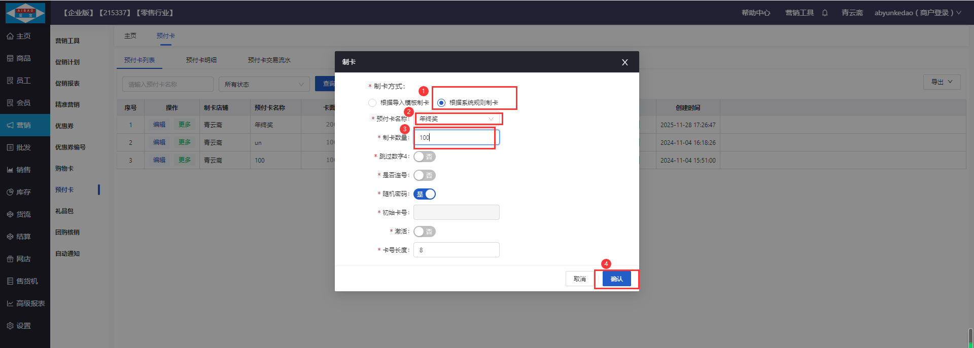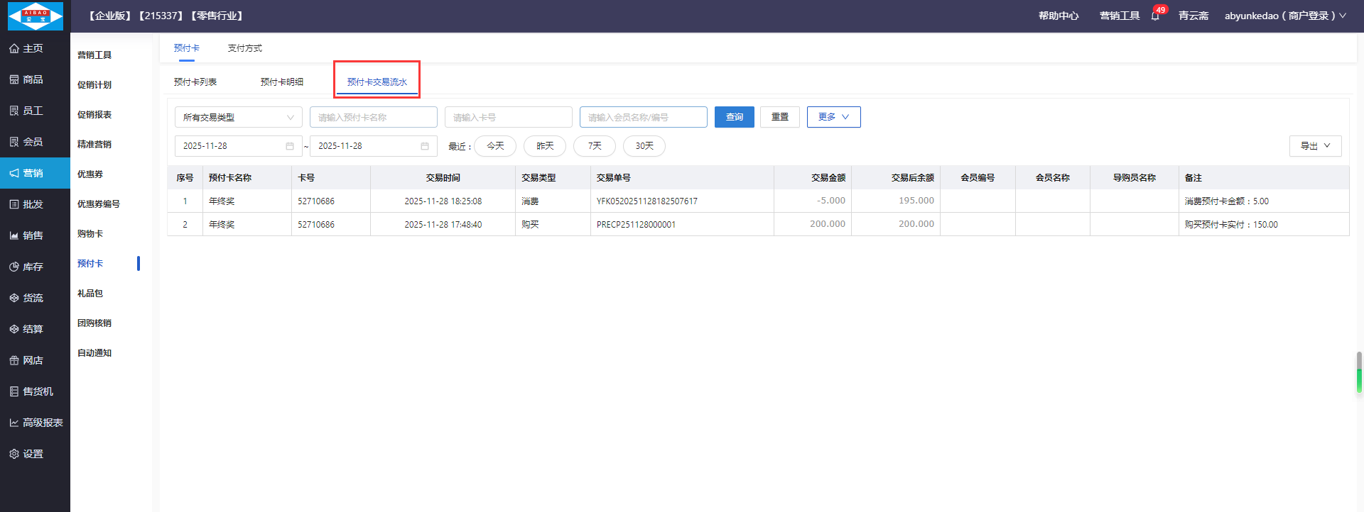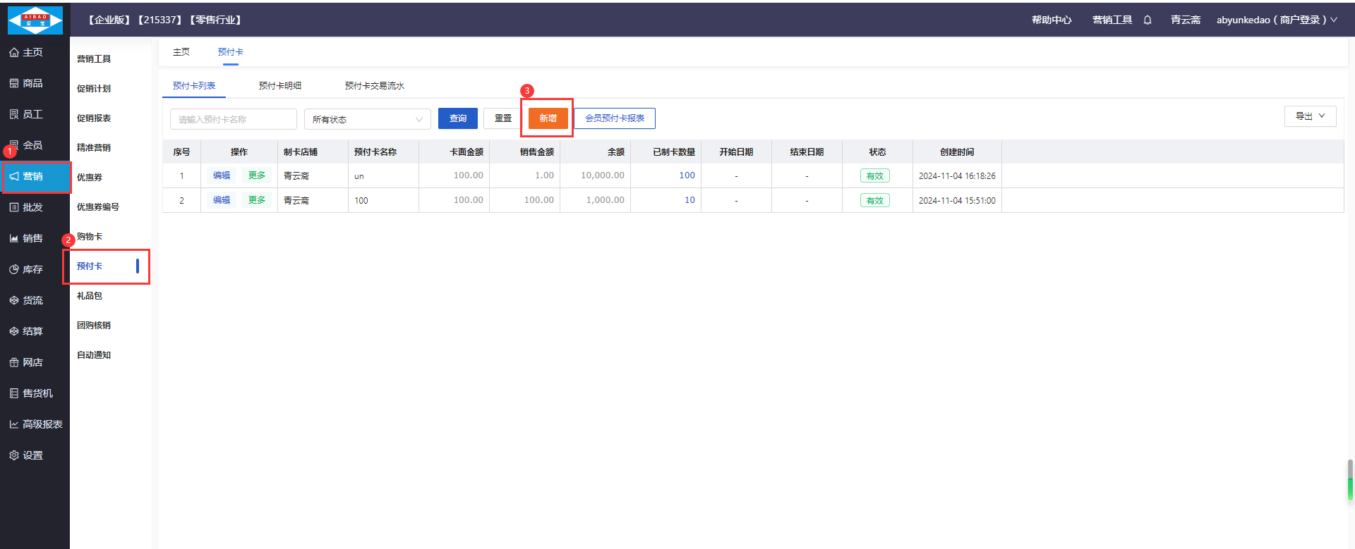 1.云后台->【设置】->【店铺管理】->【支付方式】->【云库建档】,启用预付卡付款方式。