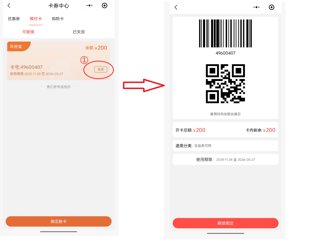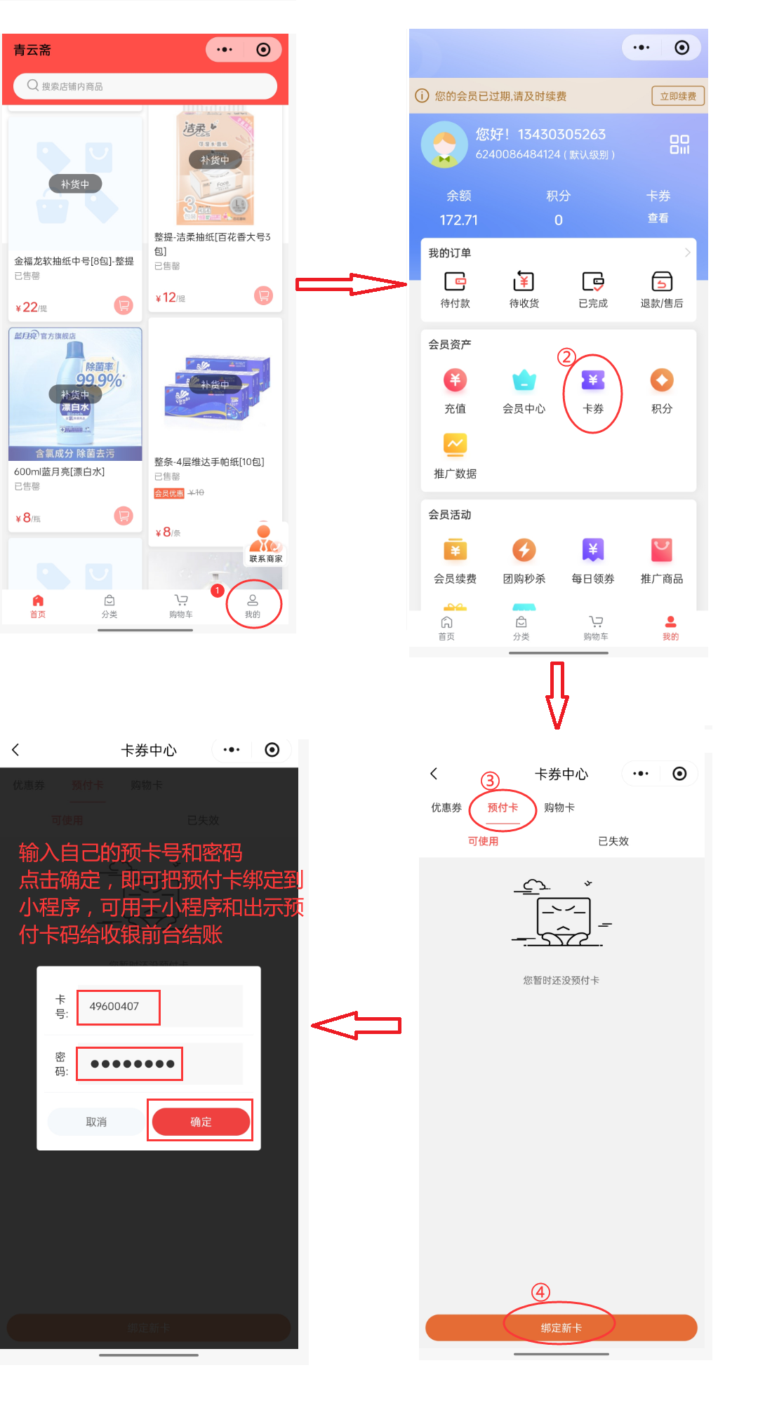 ②在小程序上操作绑定自己的预付卡(需要是已购买的预付卡)。
