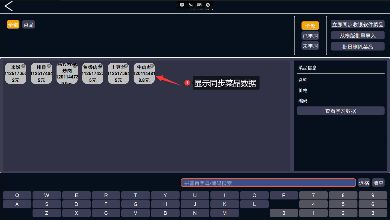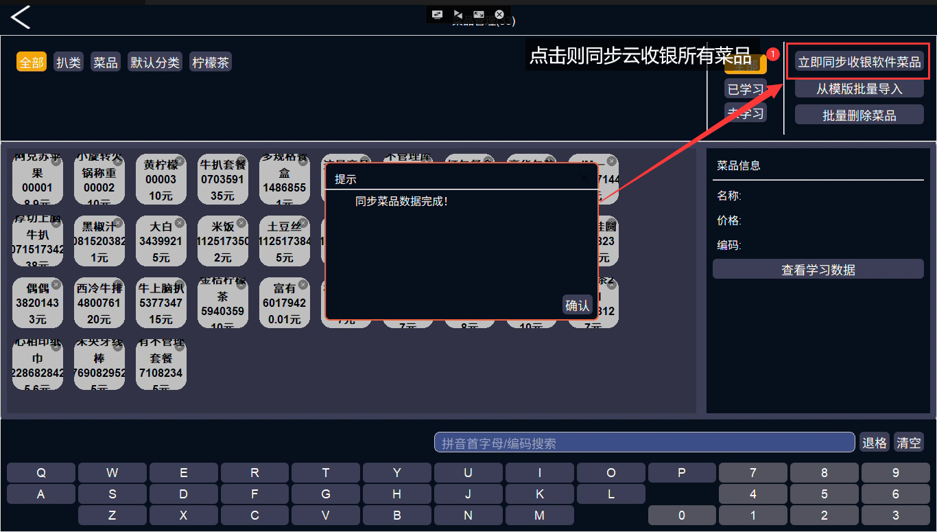 点击插件的展开窗口-点击菜品按钮打开菜品管理页面,点击立即同步收银软件菜品按钮,则同步云收银所有菜品到插件。