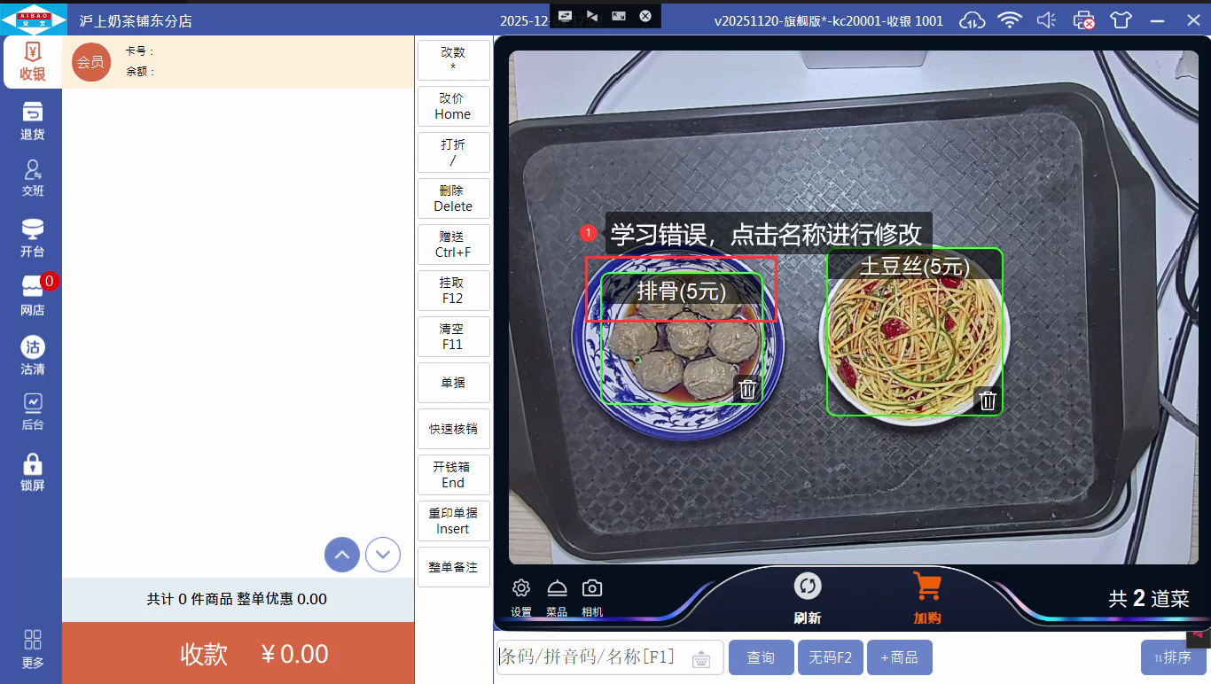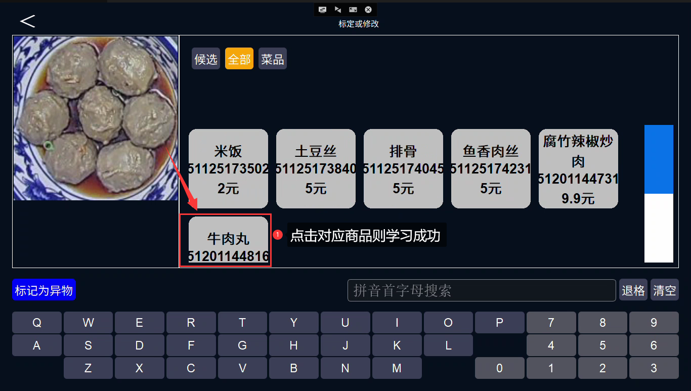 2-在标定或修改页面,根据菜品点击对应的商品则学习成功。