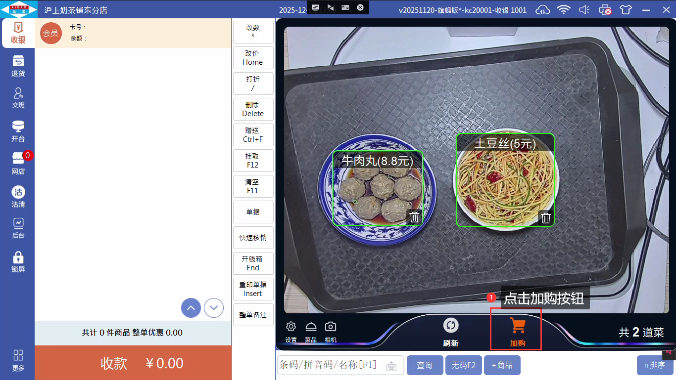 将已选好的商品放置识别区域,识别出菜品后,点击加购按钮,加入购物车,核对收款金额进行付款。