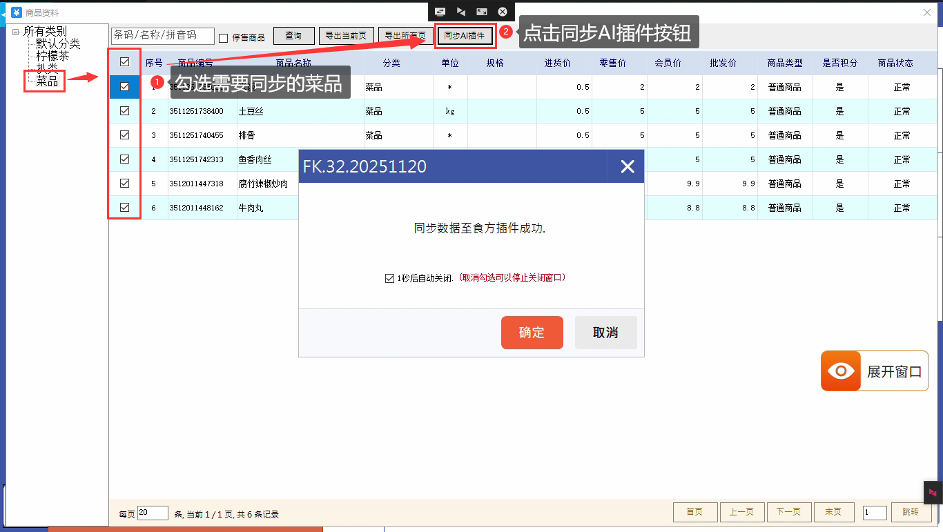 2-同步成功后,打开食方AI社餐插件菜品页面查看同步数据。操作:点击插件的展开窗口-点击菜品-显示菜品。