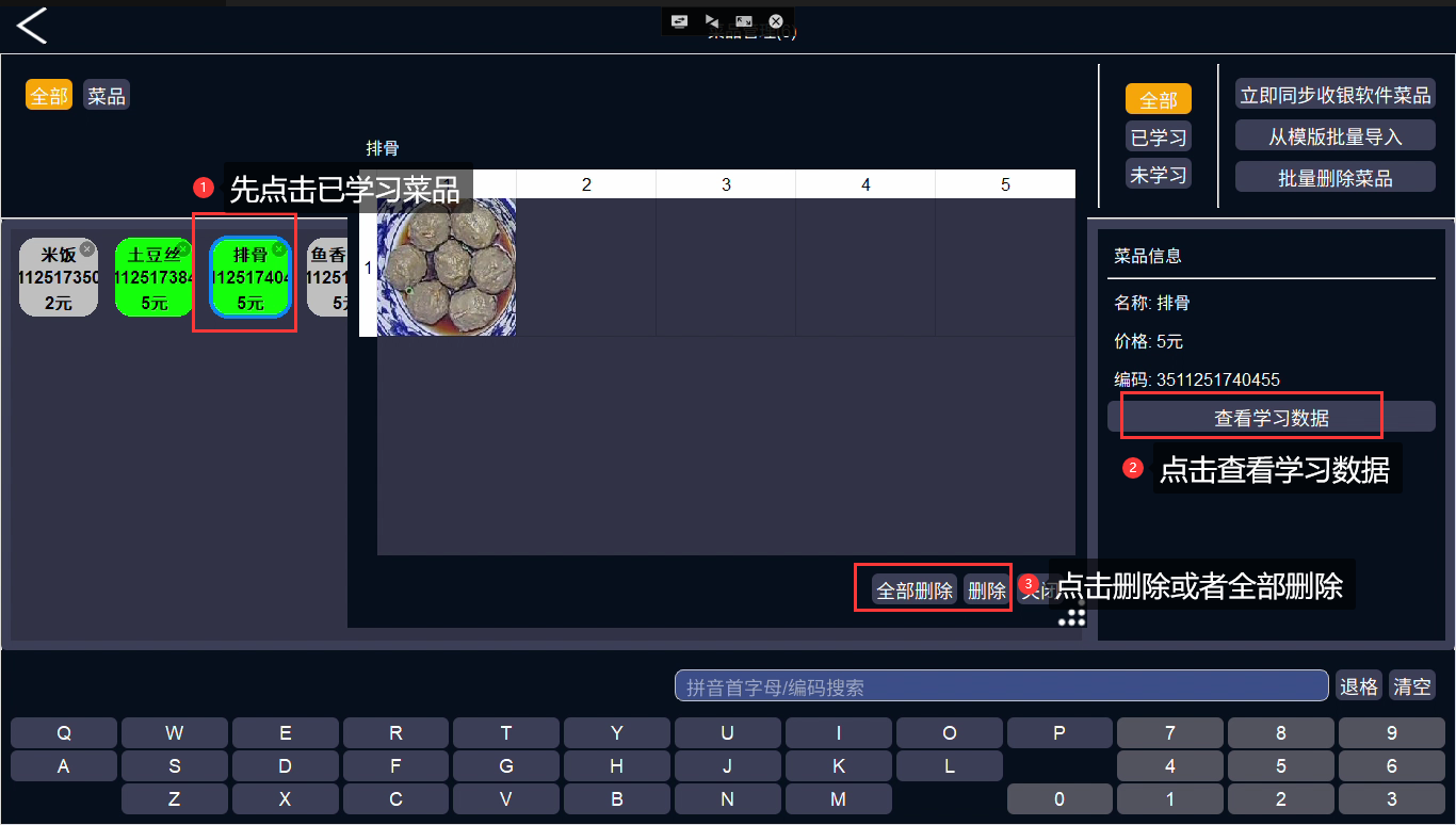 识别区域点击菜品按钮进入菜品管理页面。点击已学习菜品,再点击菜品信息栏中的查看学习数据按钮,弹出商品框点击删除则删除学习菜品。