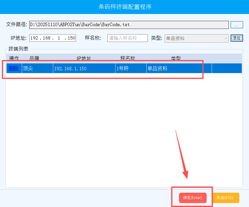 添加好条码秤信息后,点击确定