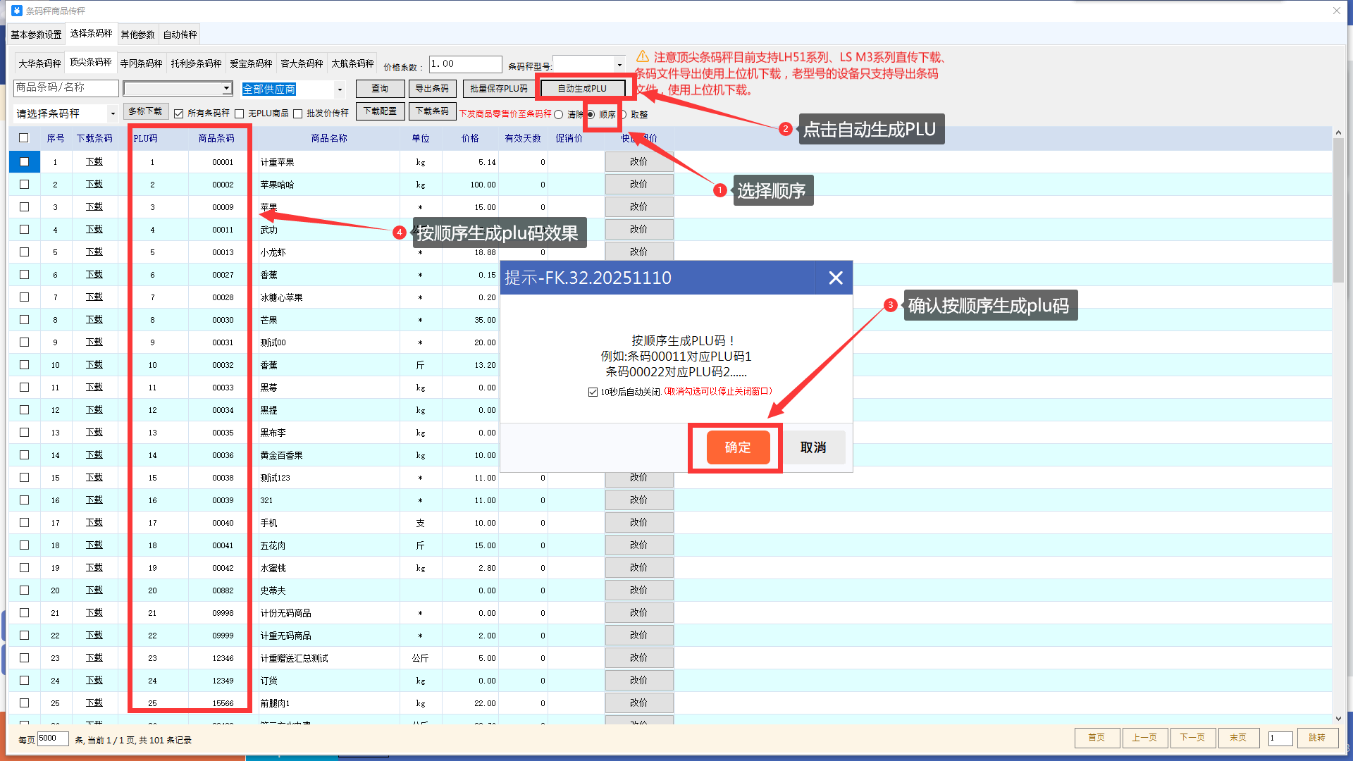 选择顺序,再点击自动生成plu,确认按顺序生成plu码