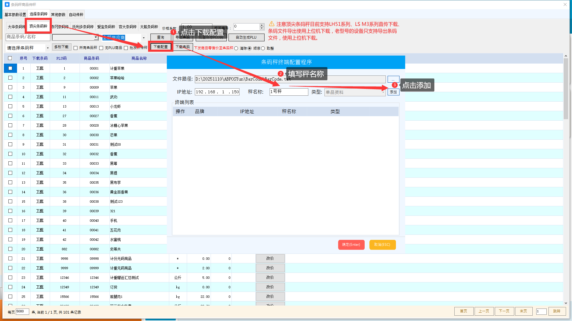 添加需要下载的条码秤ip和条码秤名称,点击下载配置,填写秤名称,点击添加