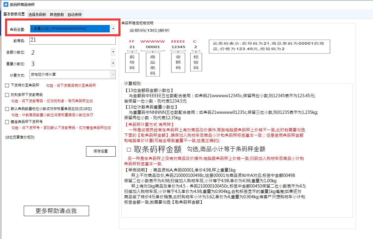 设置好条码是13位还是18位、金额小数位和重量小数位等配置