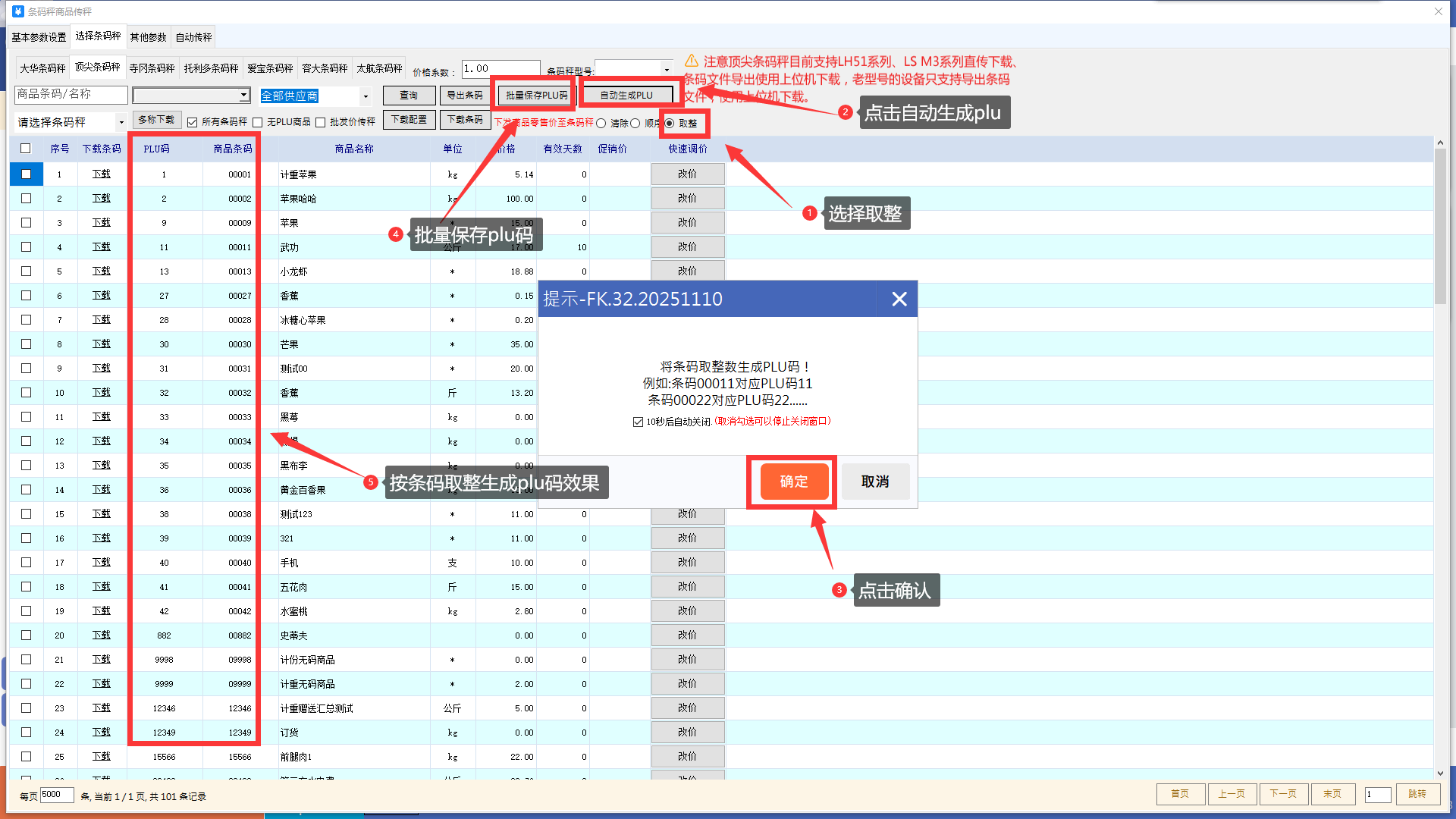 选择取整,再点击自动生成plu,确认按条码取整生成plu码,然后批量保存plu码