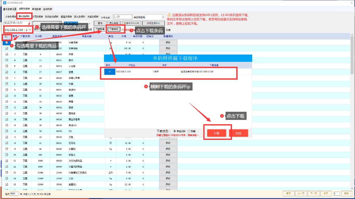 选择需要下载的条码秤(若有多个条码秤需要下发则点击“多称下载”),勾选需要下载的商品,点击下载条码,核对下发的条码秤ip,点击下载