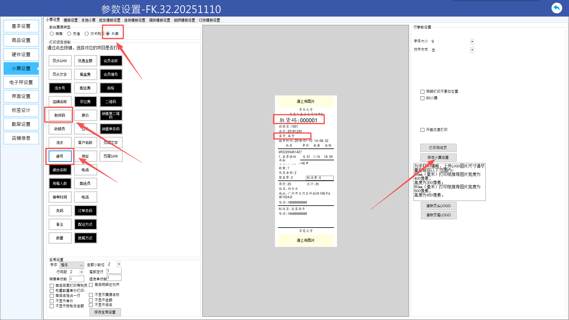 在【参数设置】-【小票设置】-【外卖】打印模板勾选取货码和桌号内容