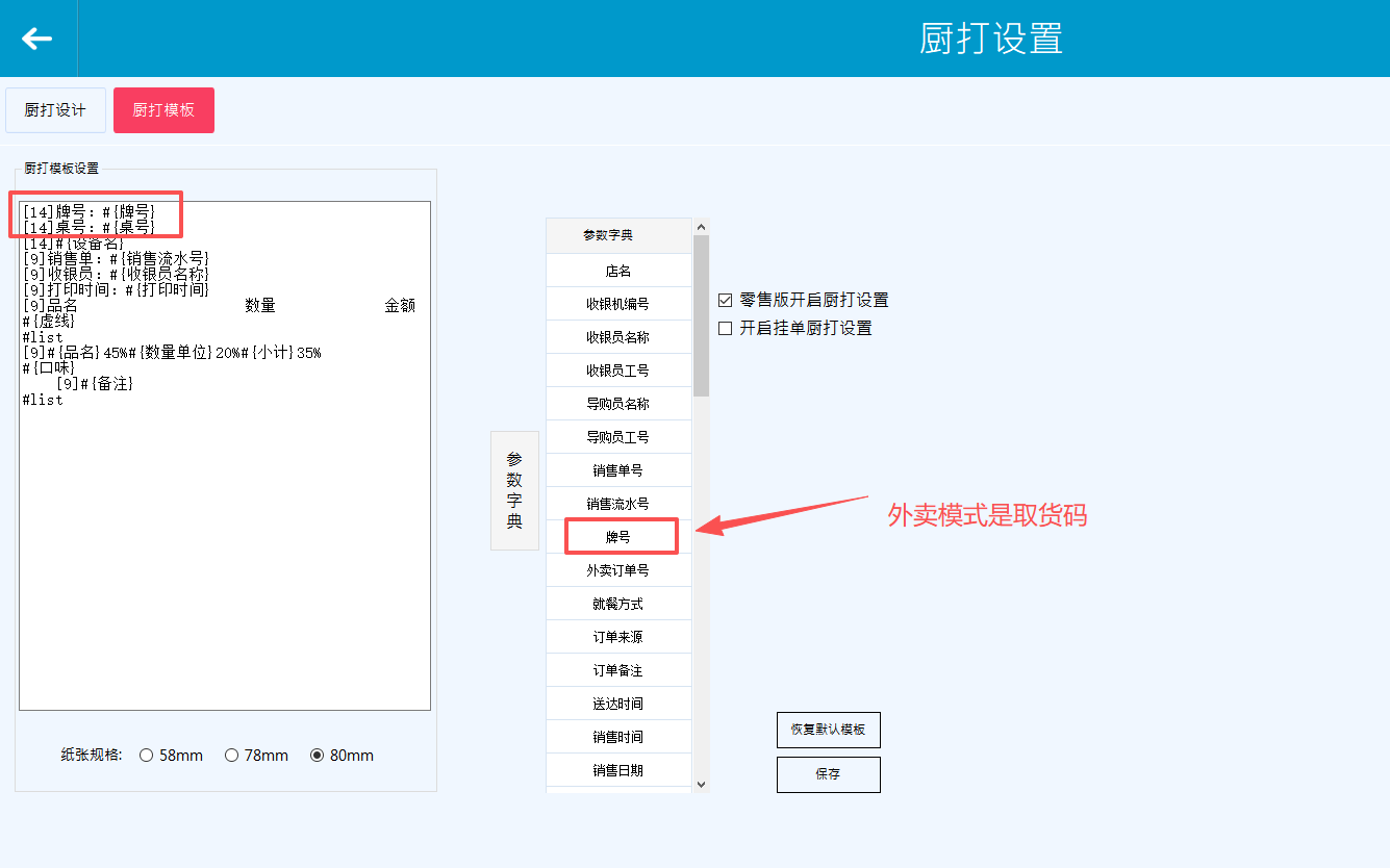 在【厨打设置】-【厨打模板】打印模板增加牌号(取货码)和桌号内容
