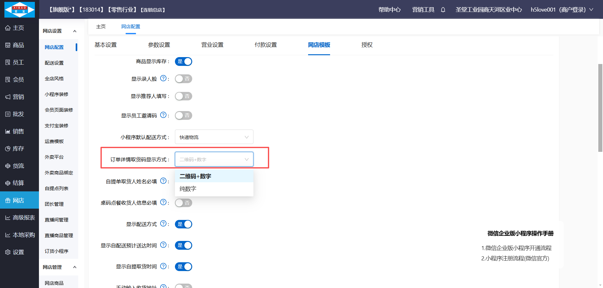 前提条件1:后台【网店配置】-【网店模板】-【页面设置】订单详情取货码显示方式设置