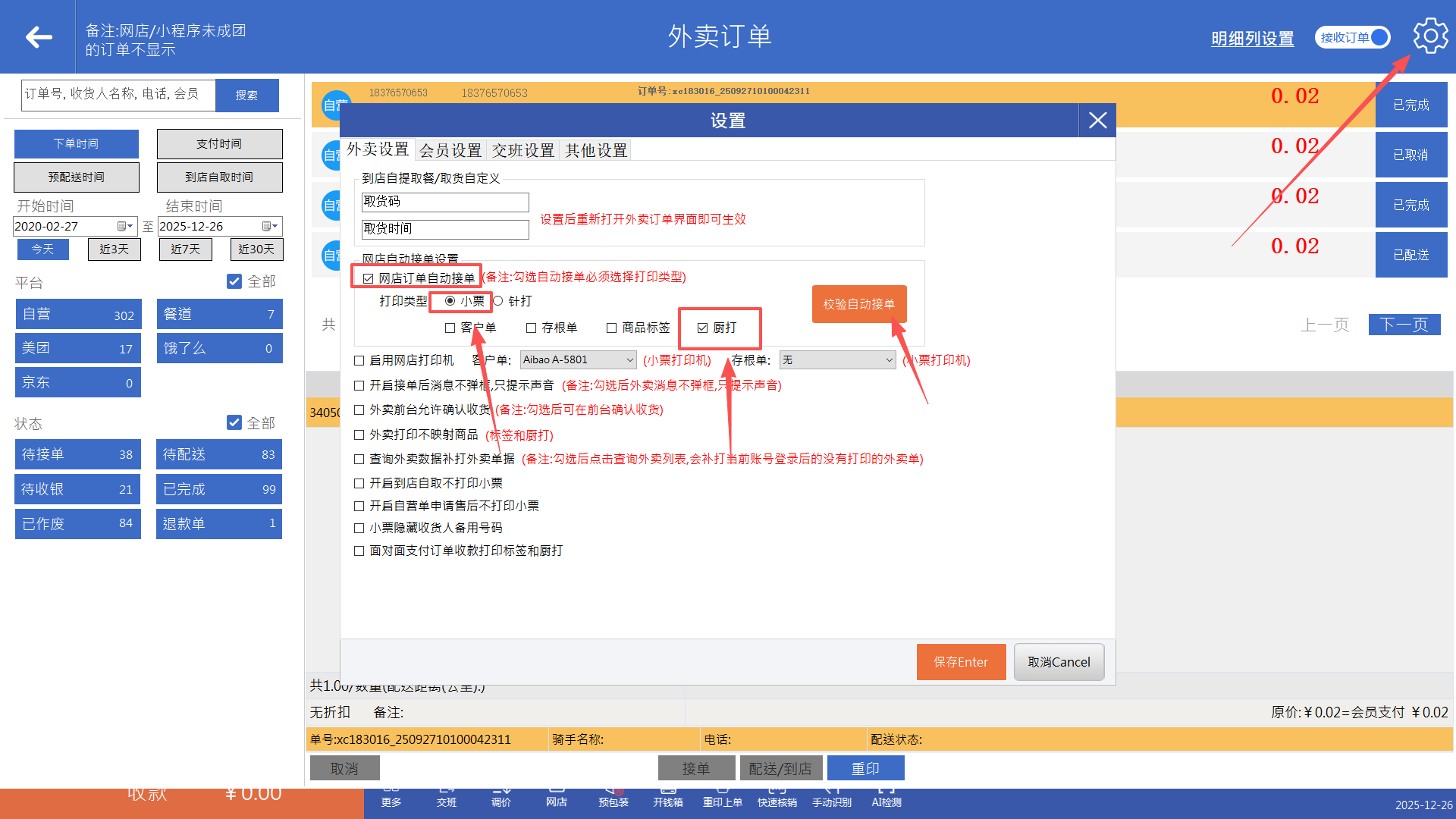 前提条件3:收银端前台外卖订单接单打印设置默认选择小票和厨打