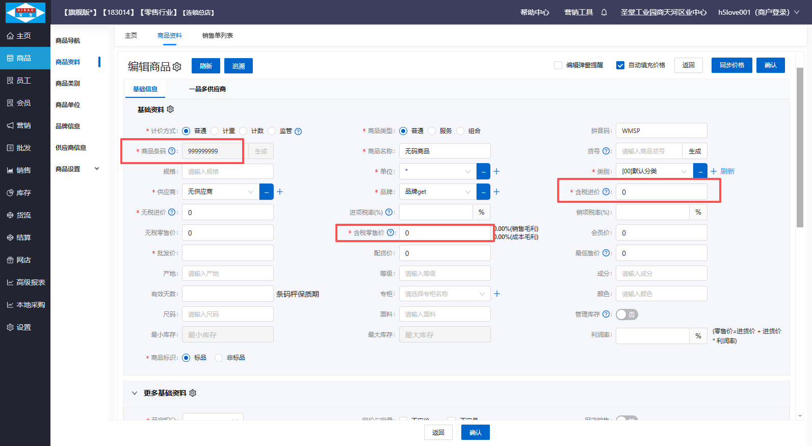 填写无码商品进货价和零售价