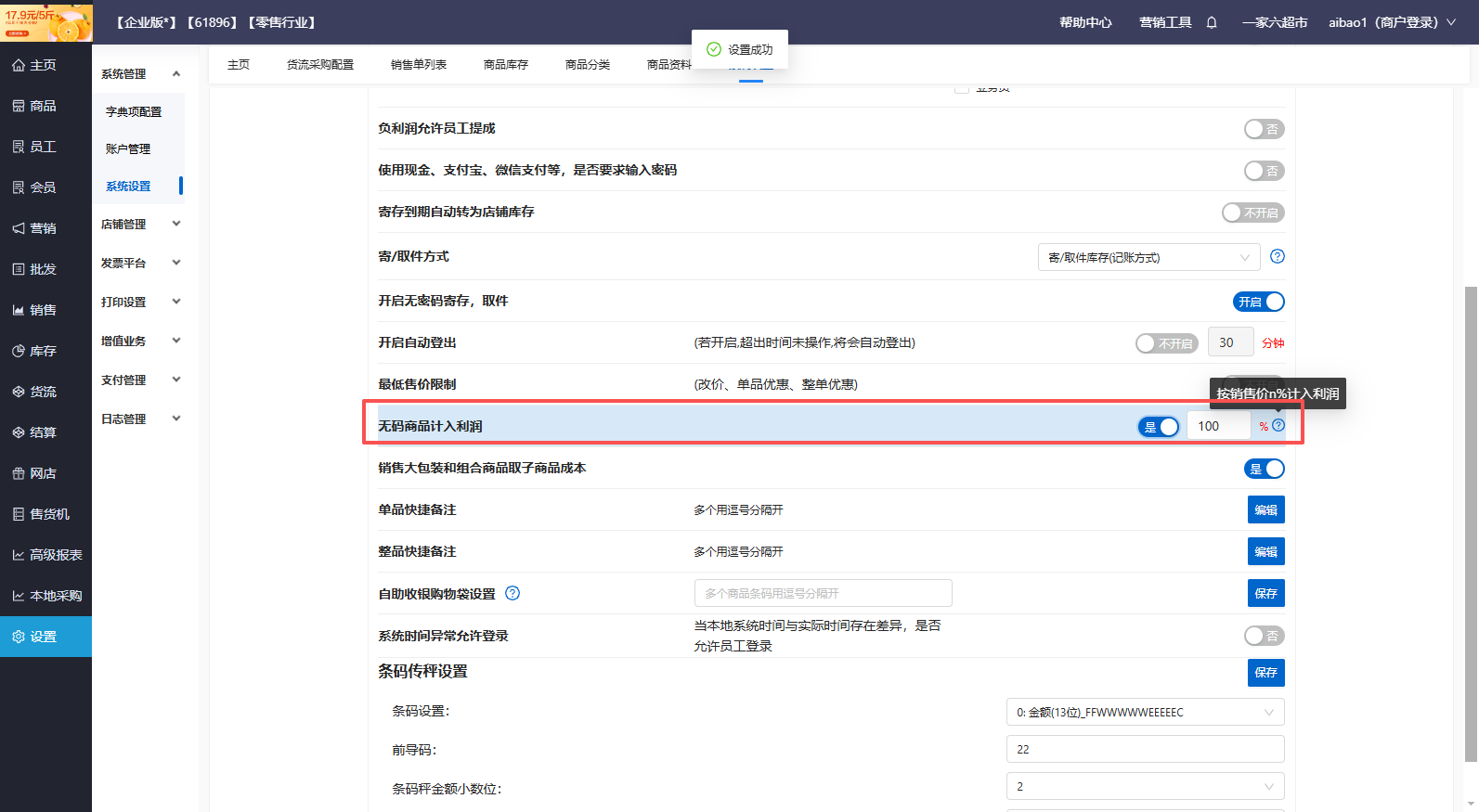 开启配置无码商品计入利润