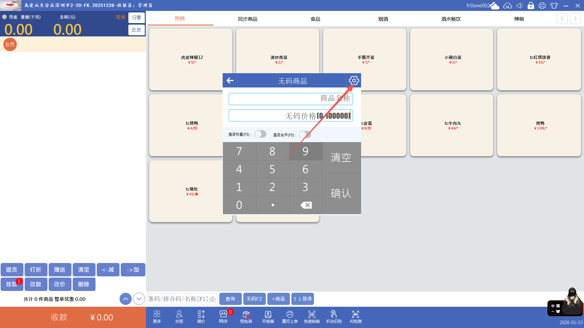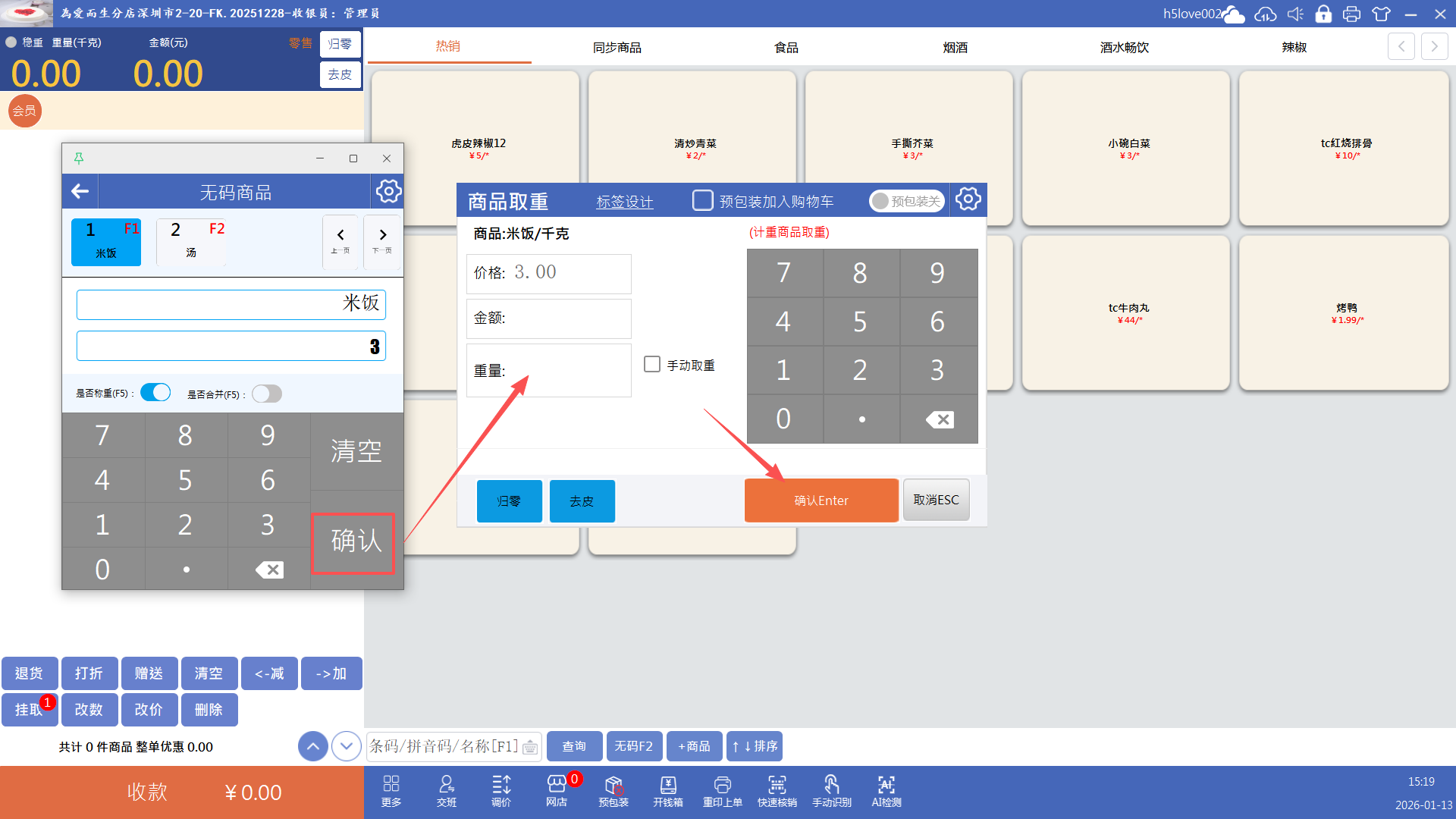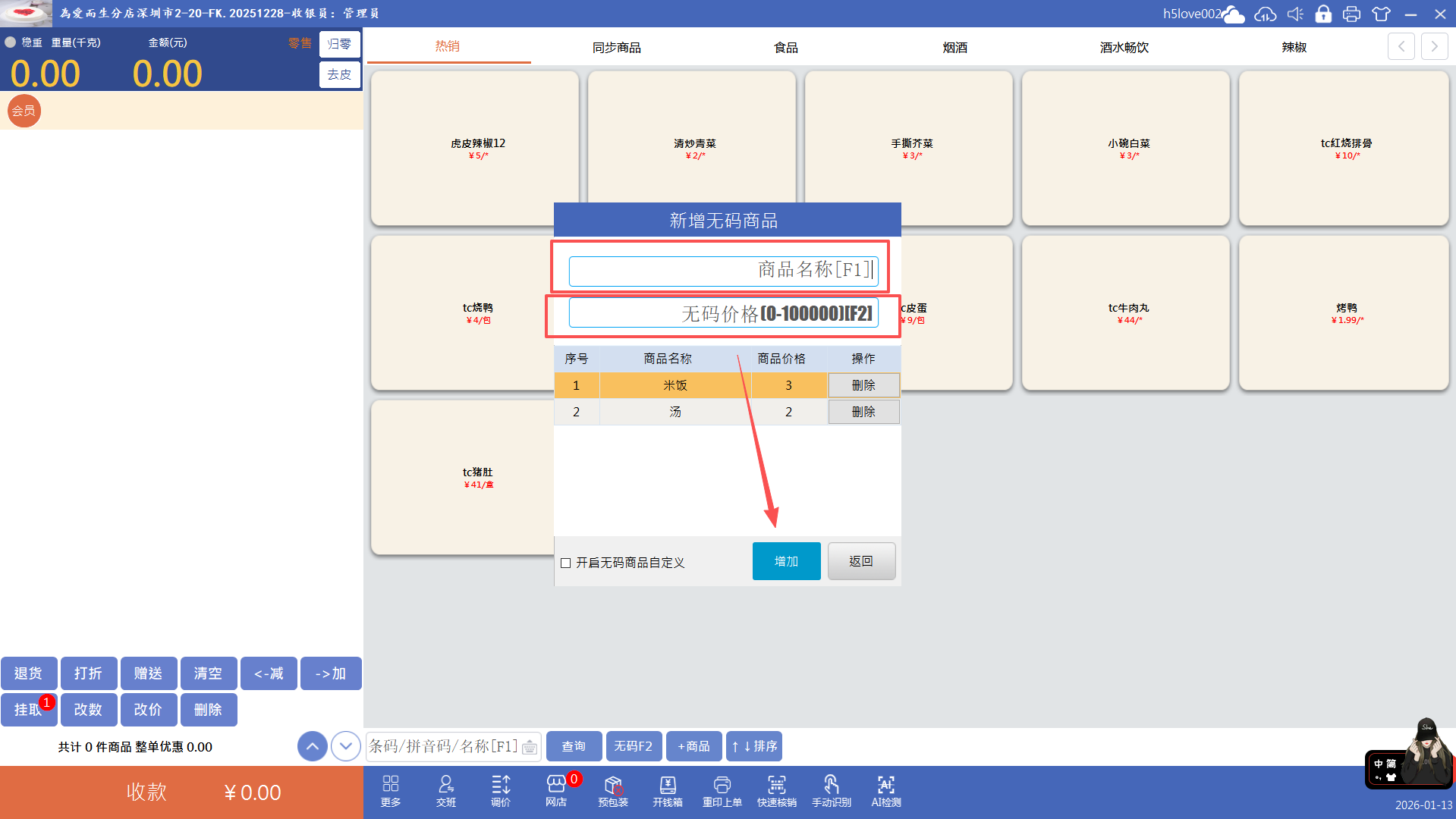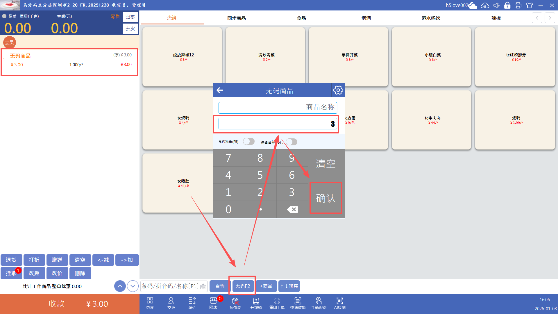 点击“无码”按钮(快捷键F2),输入价格点击确认即可添加无码商品到购物车,再收款就行