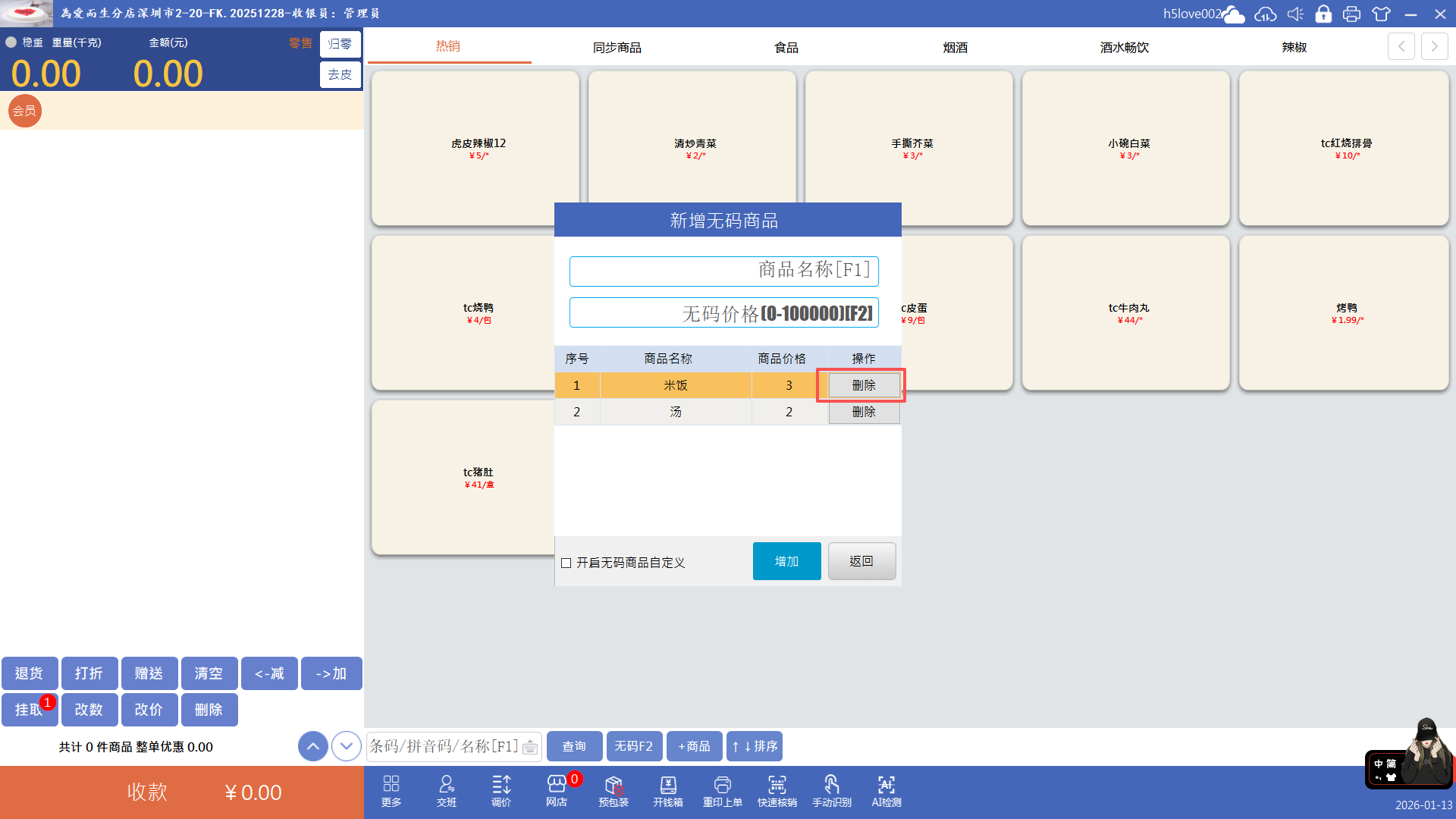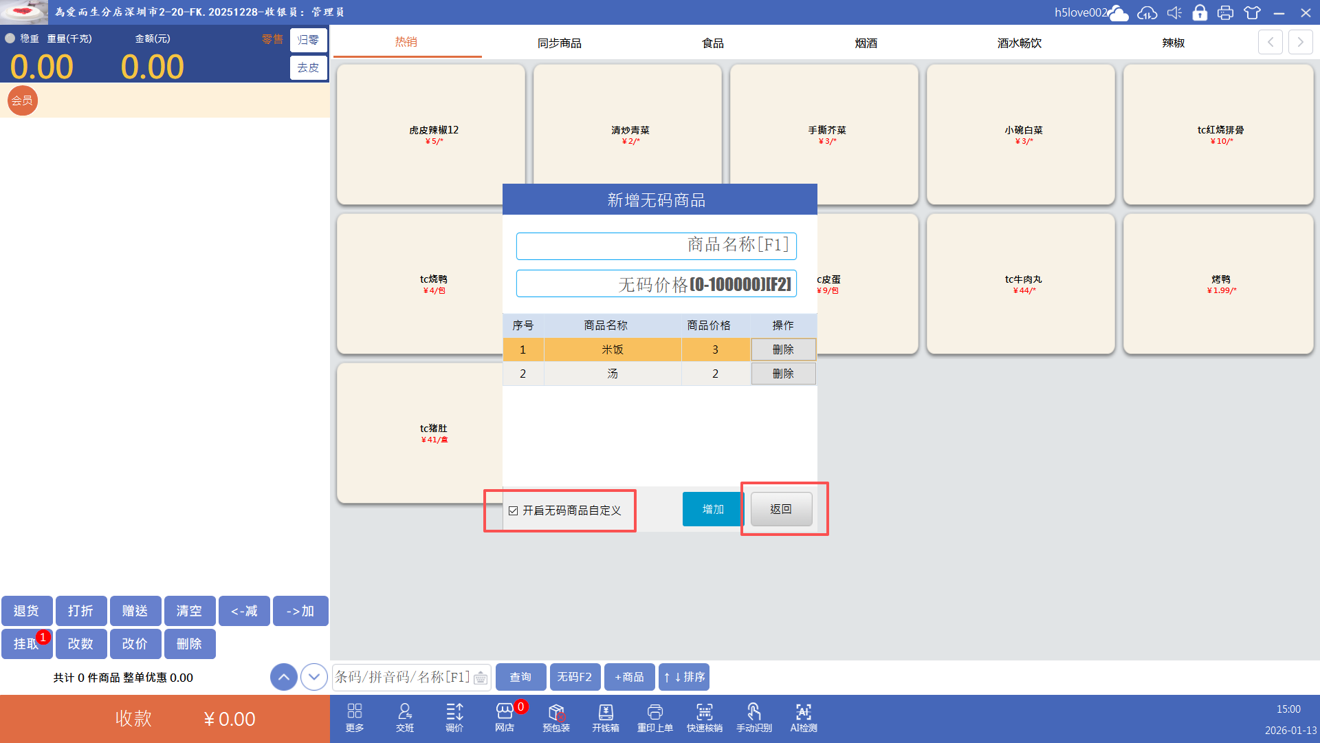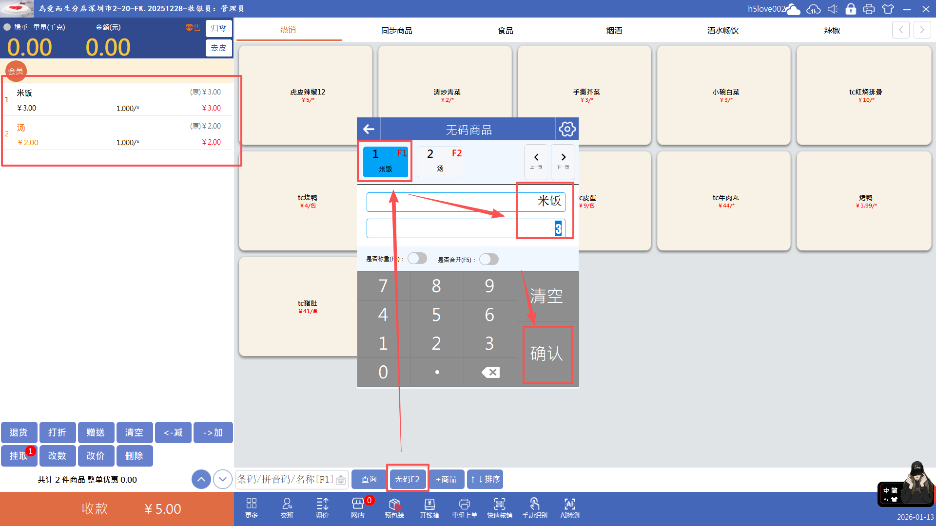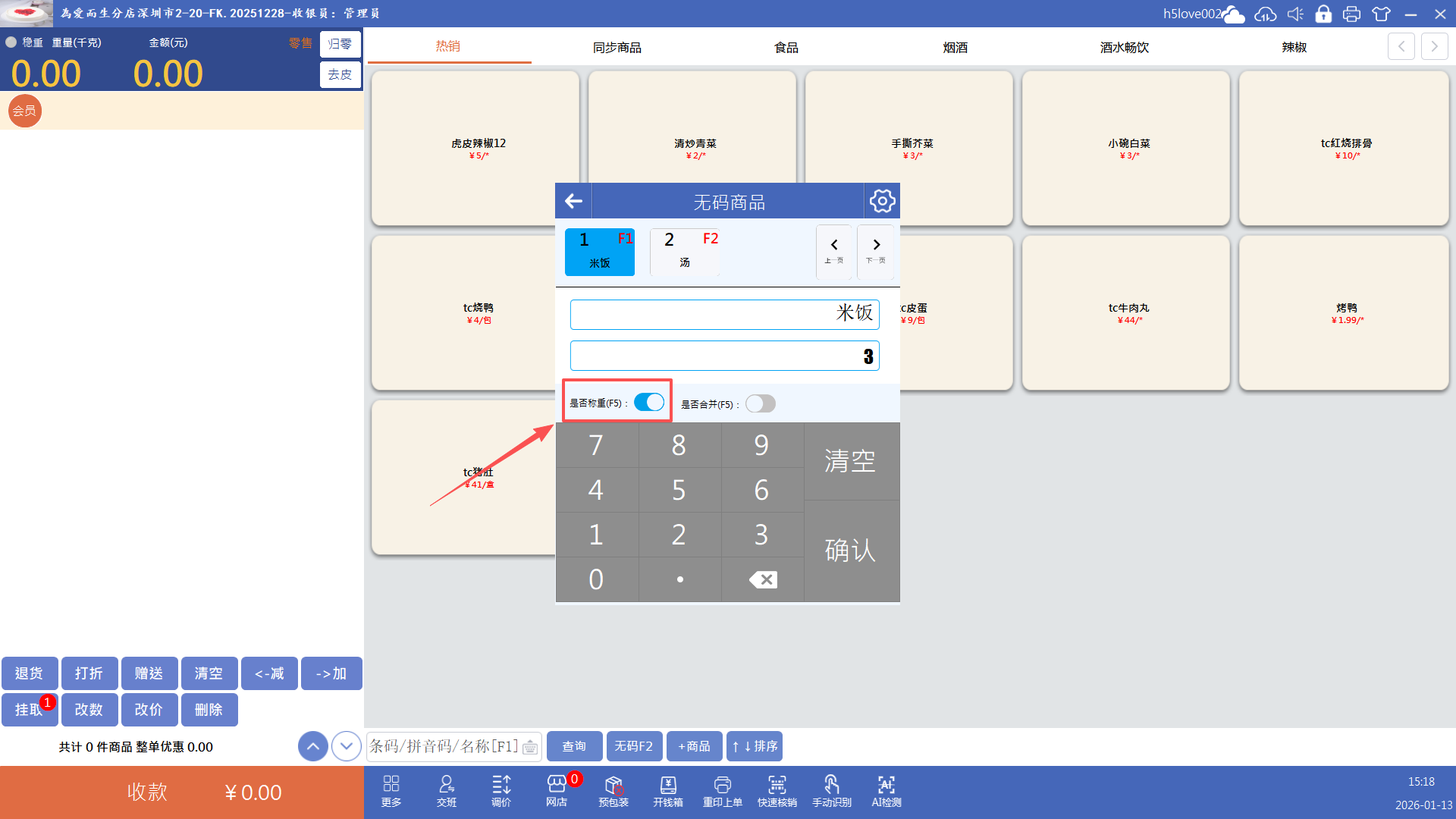 点击“无码”按钮(快捷键F2),输入价格点击确认即可添加无码商品到购物车,再收款就行