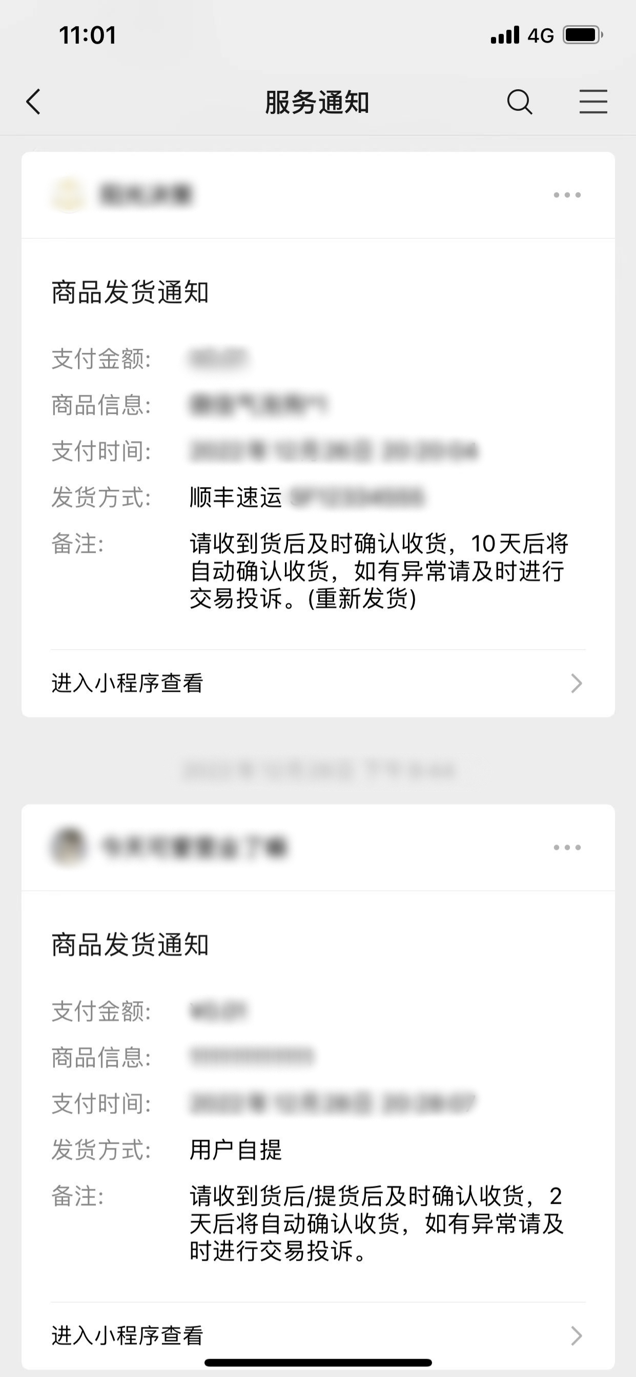服务通知入口:用户在订单发货后会收到一条【商品发货通知】的服务通知,点击该通知即可进入订单详情页并找到确认收货按钮