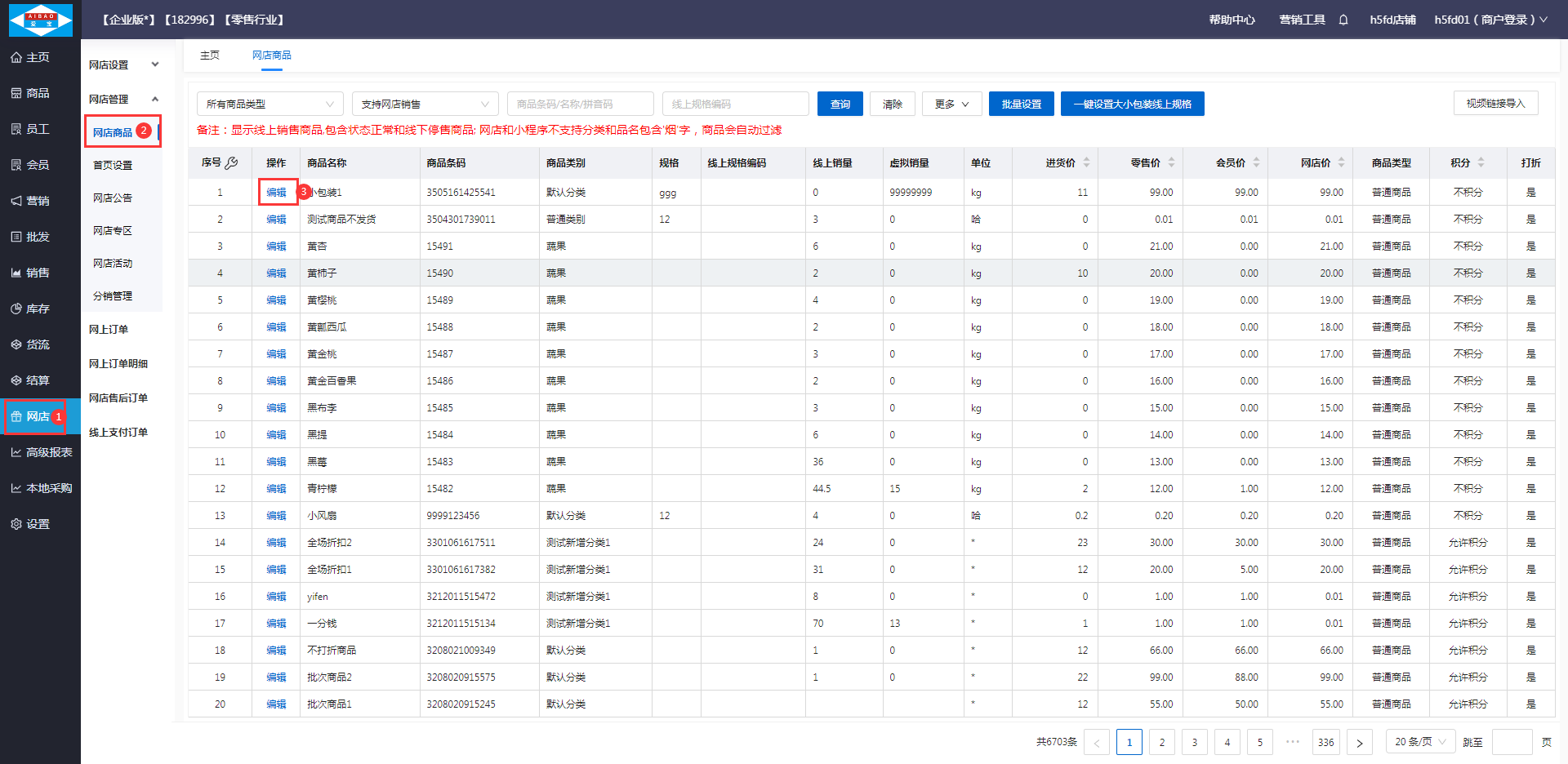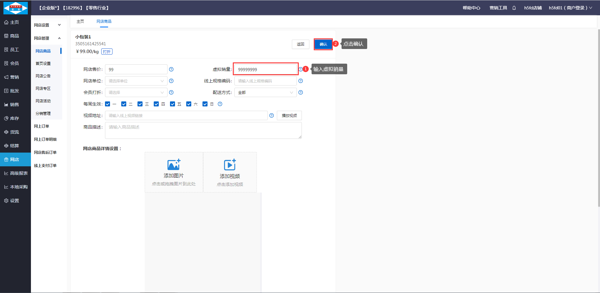 2.2 设置商品虚拟销量:打开【网店】-【网店商品】,点击编辑按钮,输入商品虚拟销量(如不需要填写商品销量请忽略此步骤);