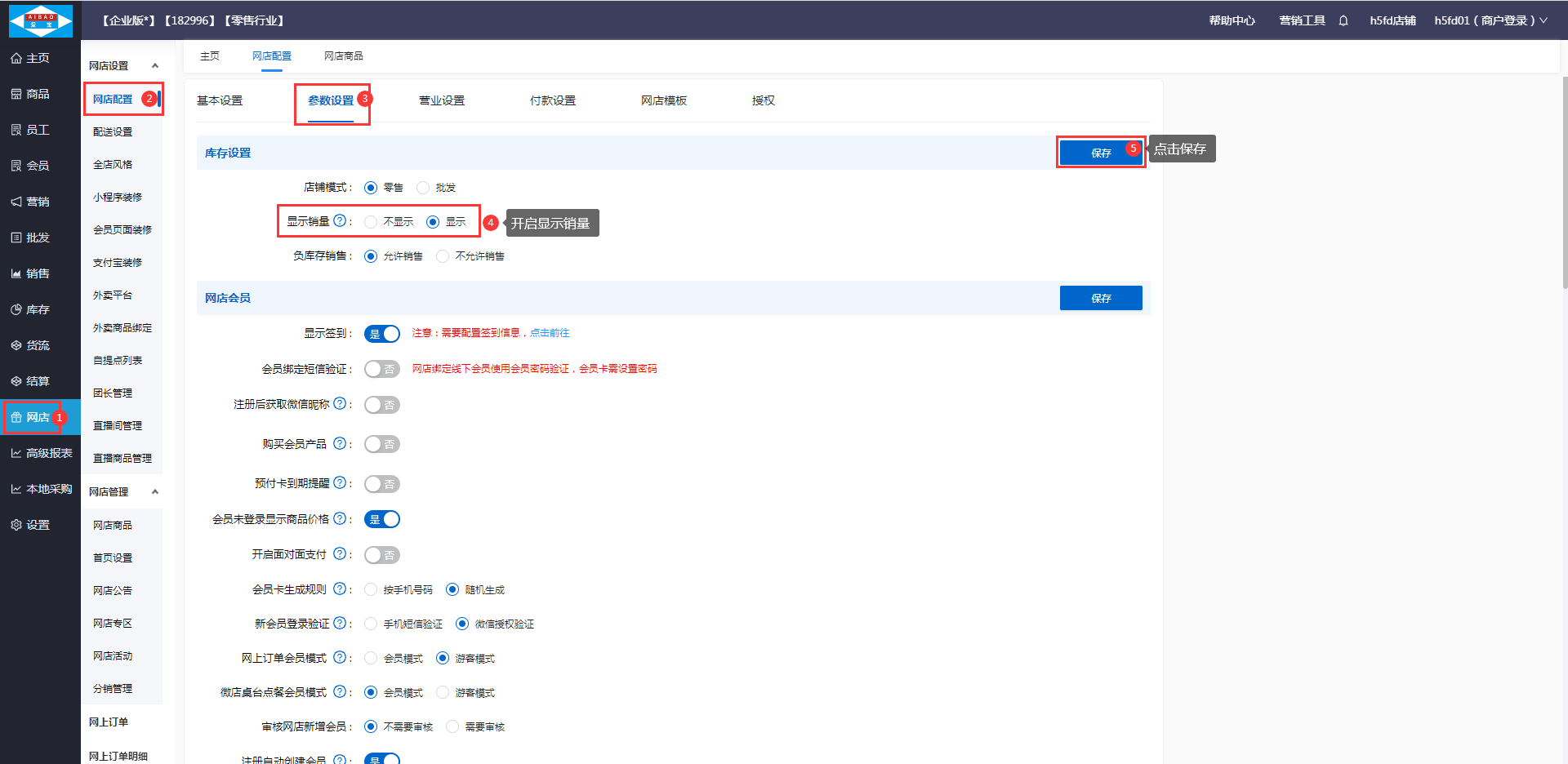 2.1 打开【网店】-【网店配置】-【参数设置】,开启显示销量,点击保存;