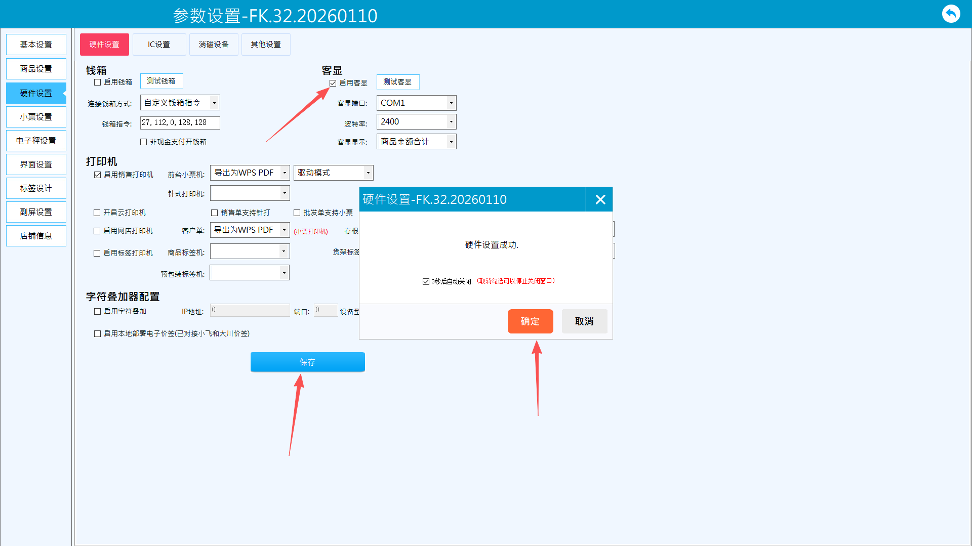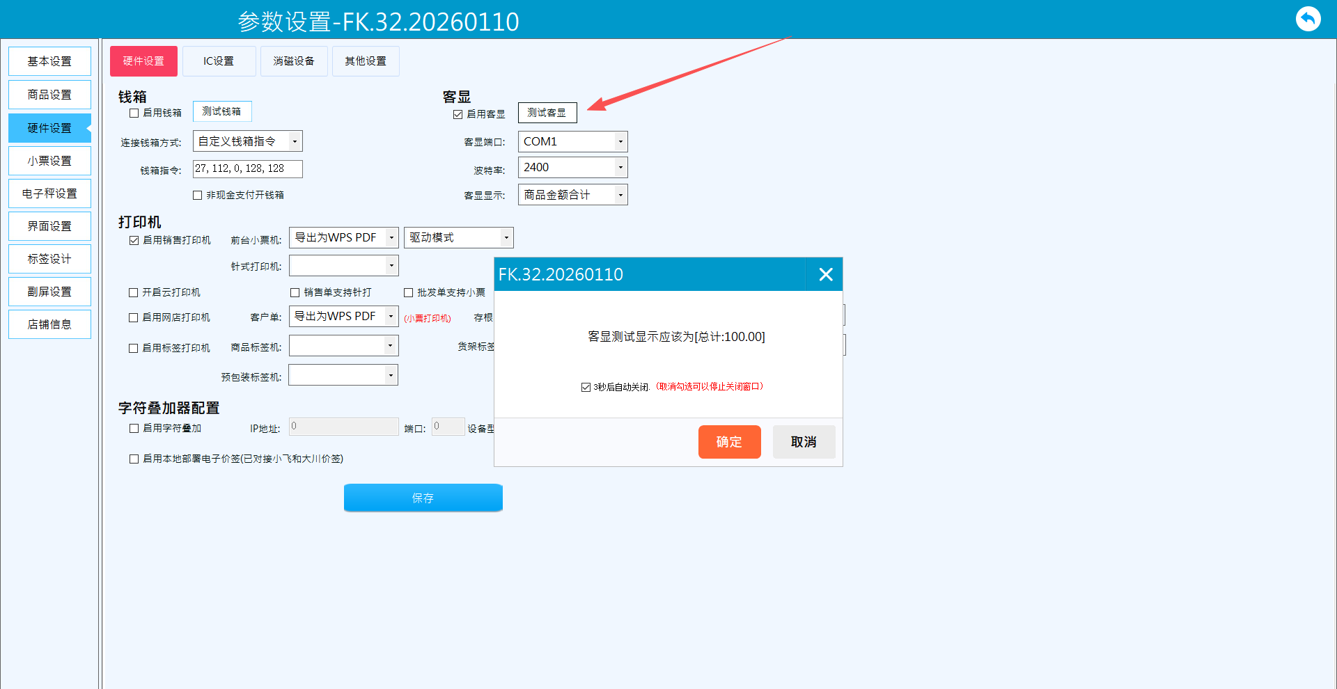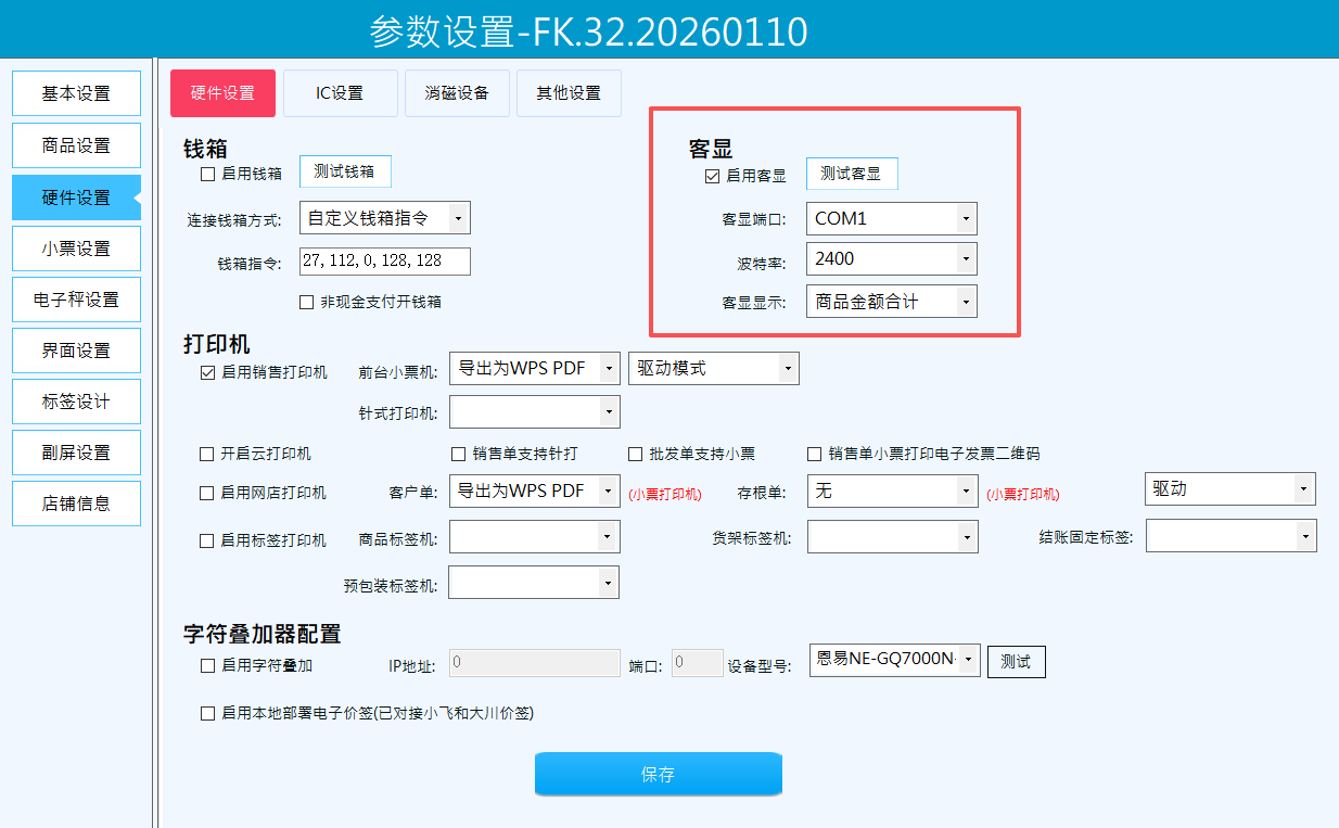勾选“启用客显”,连接客显时选择客显端口,配置波特率。一般客显端口不确定,需要重复试几遍。默认波特率为2400,少数波特率为9600。
