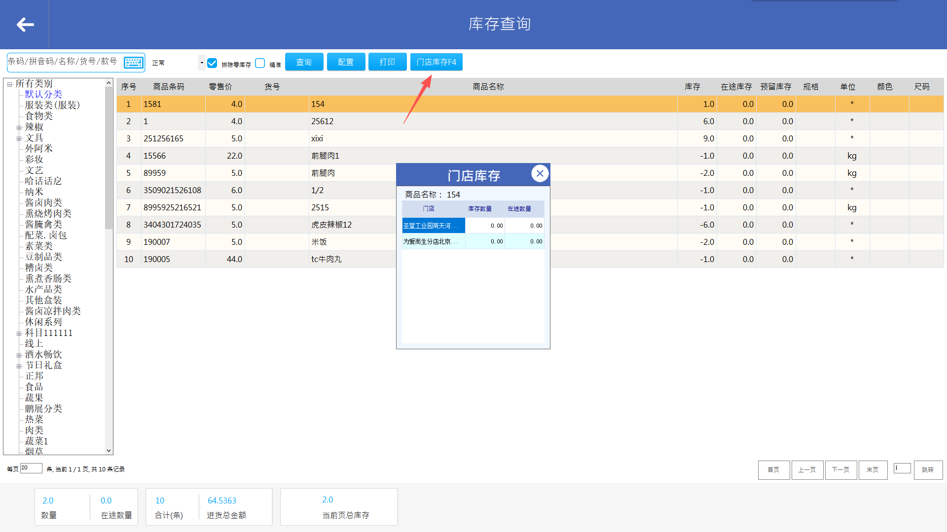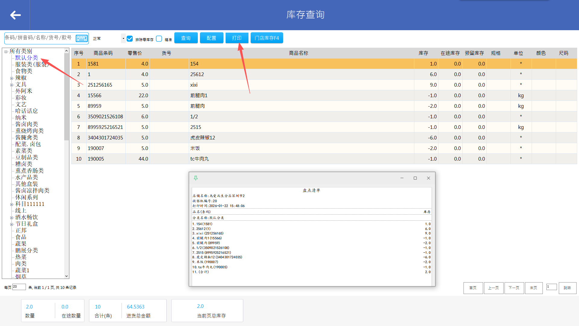 选择分类,点击“打印”,可打印商品库存