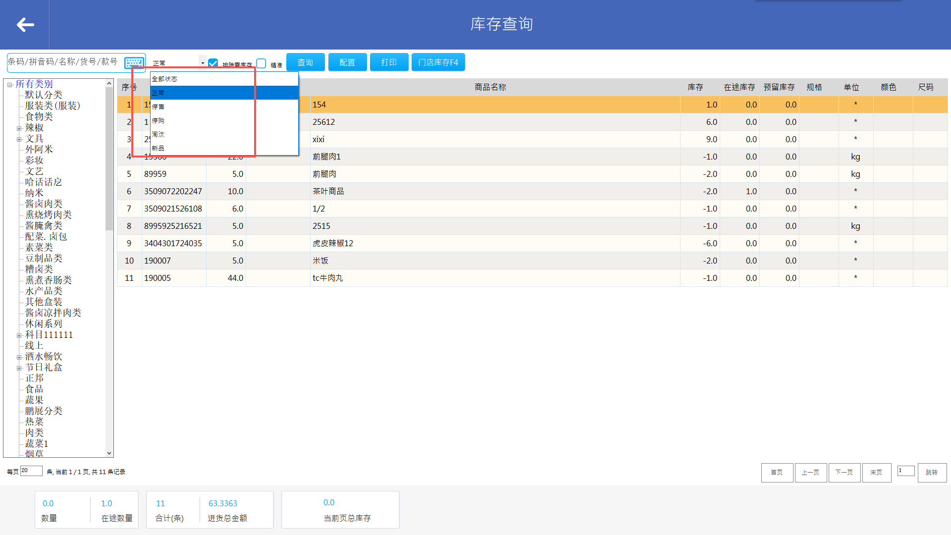 默认查询商品状态为“正常”的商品,需查询停售、停购、淘汰、新品、全部状态的商品则切换查询条件
