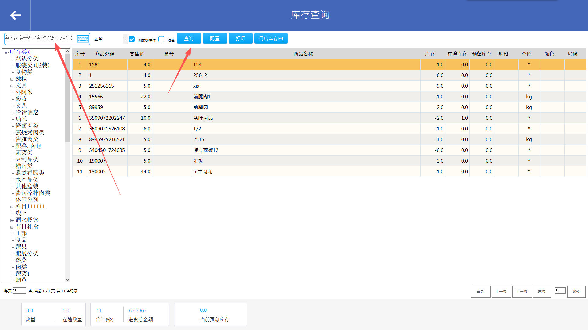 输入商品信息,支持条码、拼音码、商品名称、货号、款号,点击查询即可看到库存。