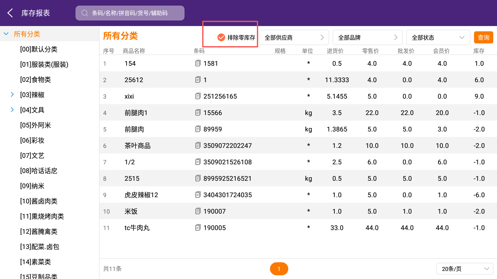 查询条件默认排除零库存商品,取消勾选可查询零库存商品