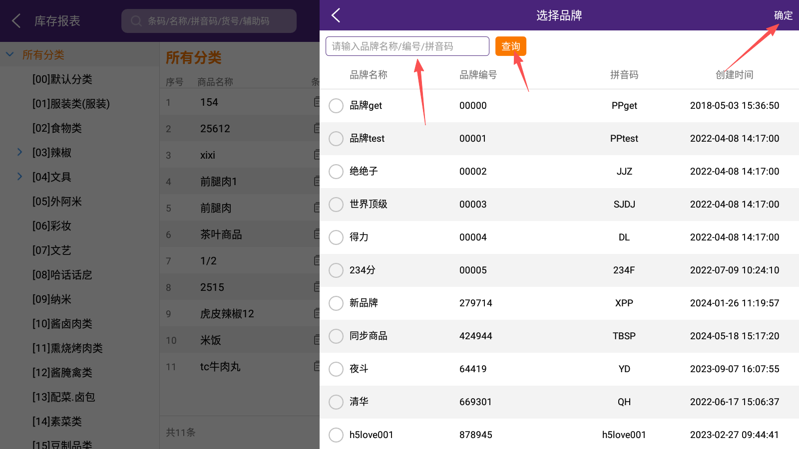 查询条件默认全部品牌的商品,点击品牌可以选择品牌进行查询