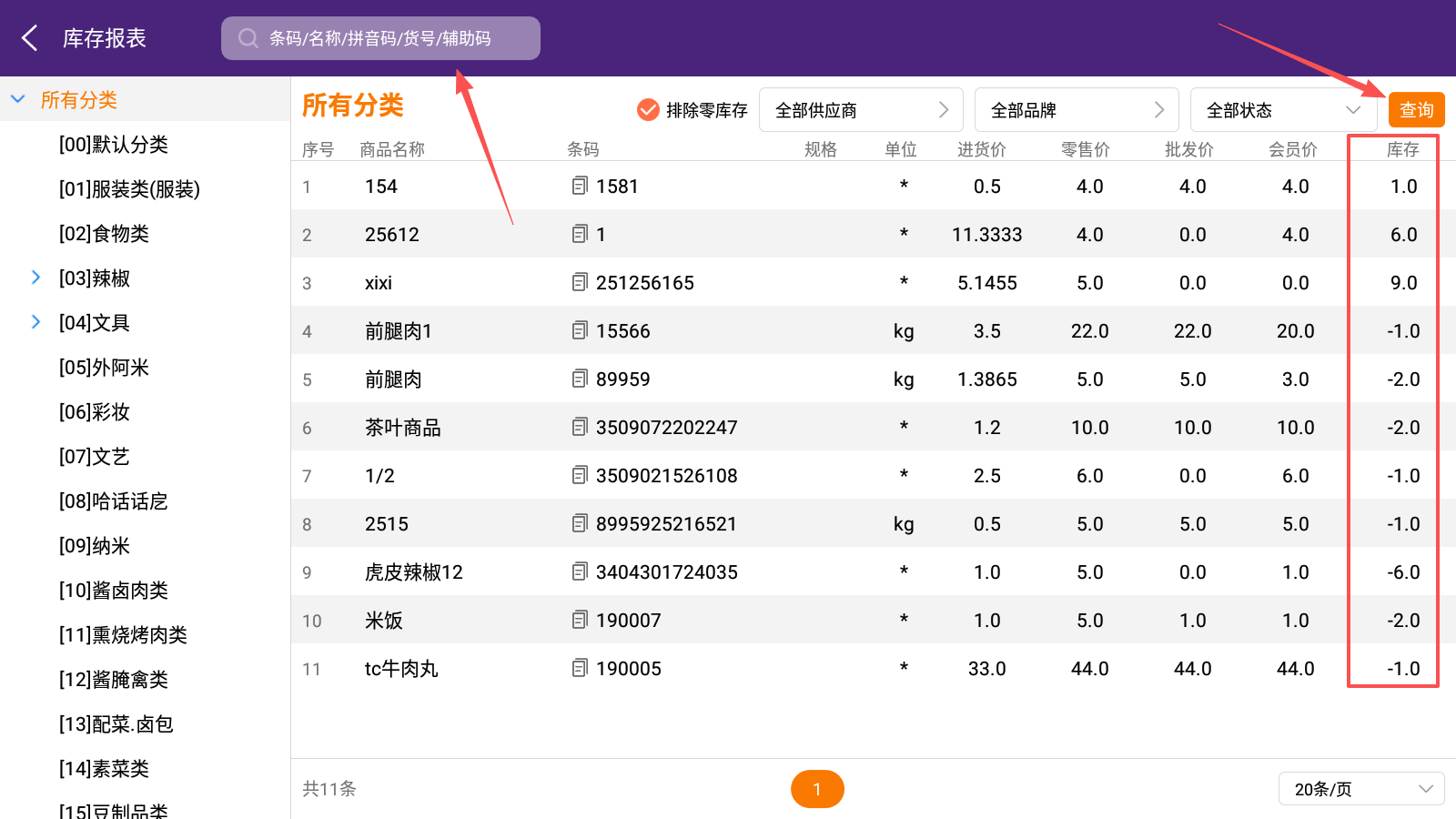 输入商品信息,支持条码、拼音码、商品名称、货号、辅助码,点击查询即可看到库存。