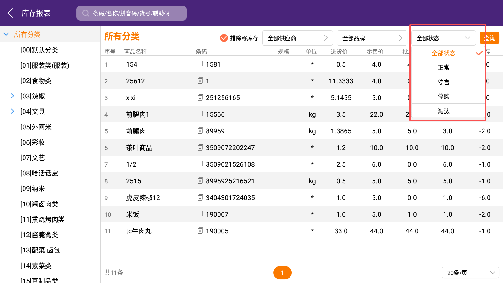 默认查询商品状态为“全部状态”的商品,需查询正常、停售、停购、淘汰的商品则切换查询条件