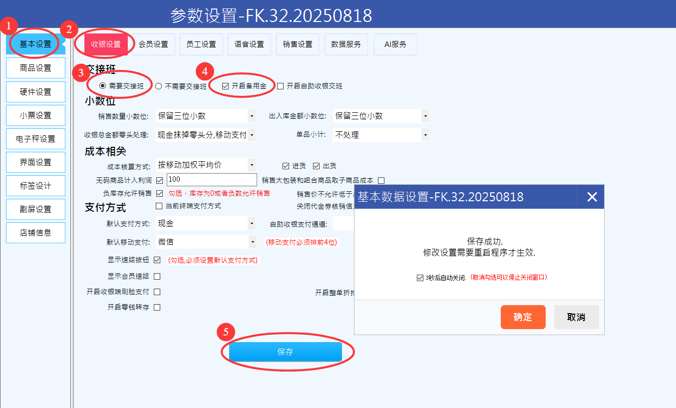 2)选择【基本设置】-【收银设置】选择【需要交接班】,并根据自己的需要是否【开启备用金】,最后点【保存】。