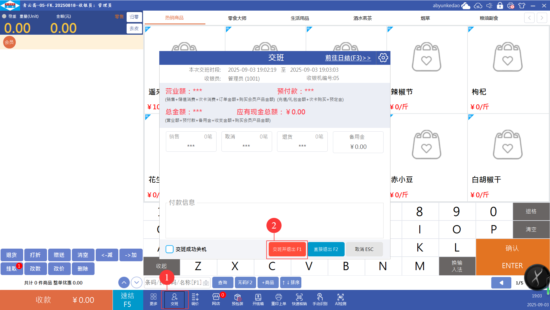 收银员登录前台收银,到点交班,在与另一收银员交接班时,可在前台点【交班】选择【交班并退出】即可进行交班。