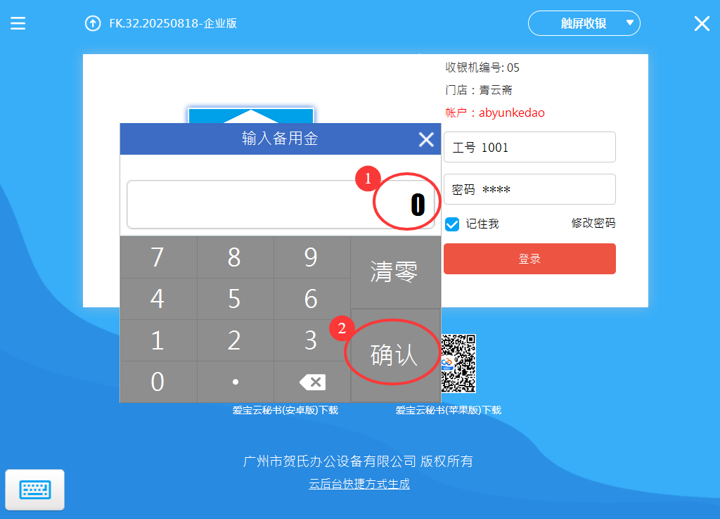 若有勾选【开启备用金】则在收银员登录时会弹窗给收银员输入备用金金额,如下图。