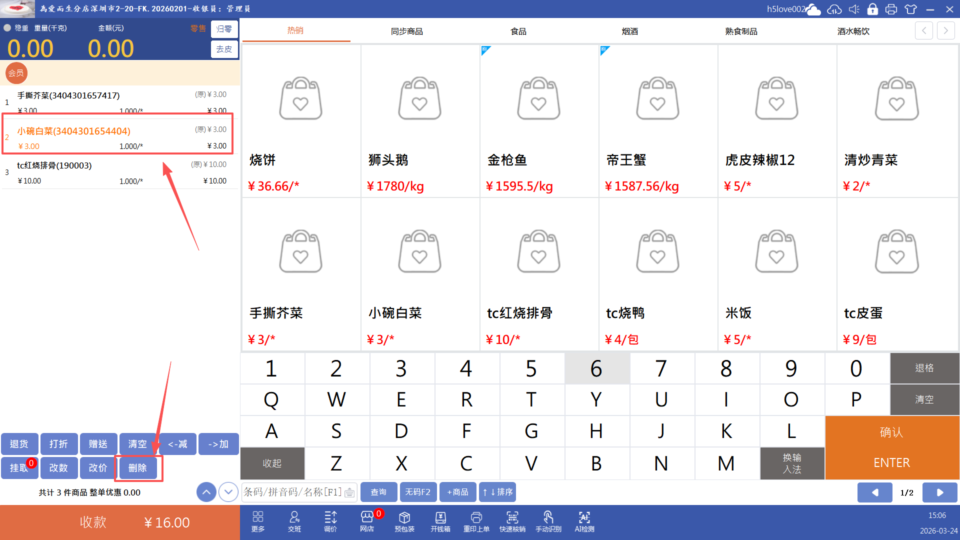 点击删除:选中商品后,点击界面上的【删除】按钮