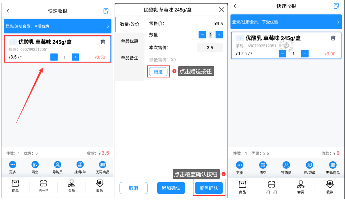 选择需要赠送的商品加入购物车,购物车内点击该商品,弹出商品框后,点击赠送按钮,再点击覆盖确认按钮。(无商品赠送权限的员工,安卓手机收银目前不支持授权)