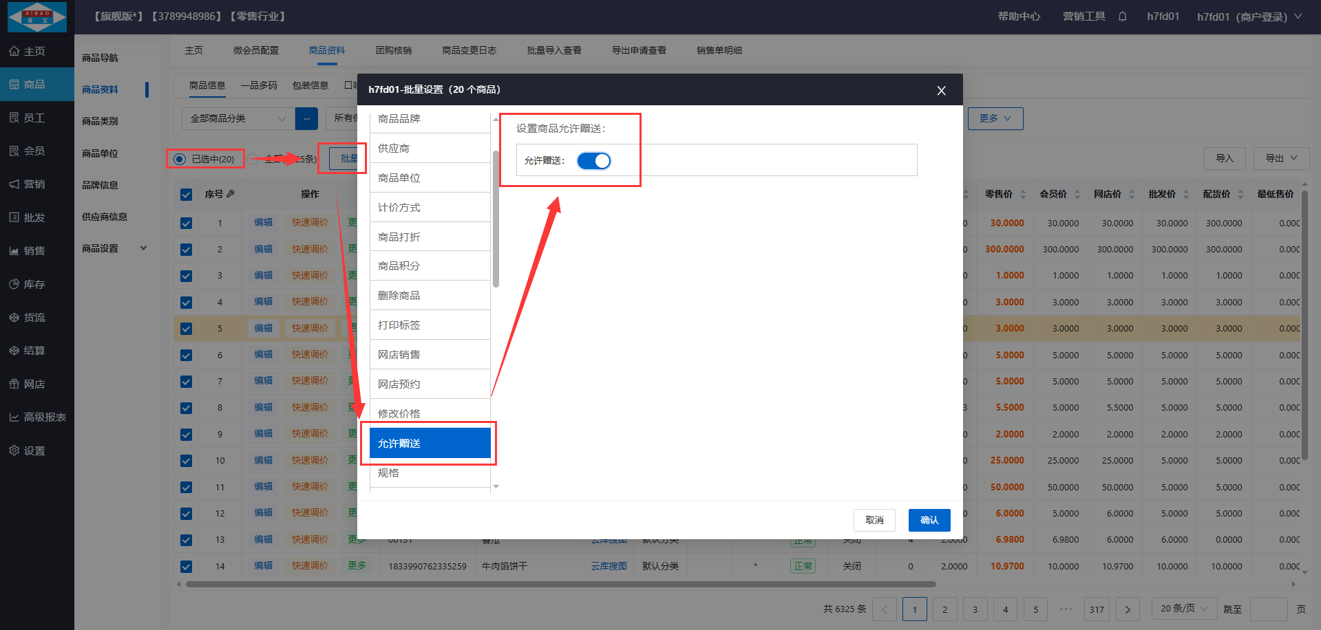 2、商品批量打开允许赠送