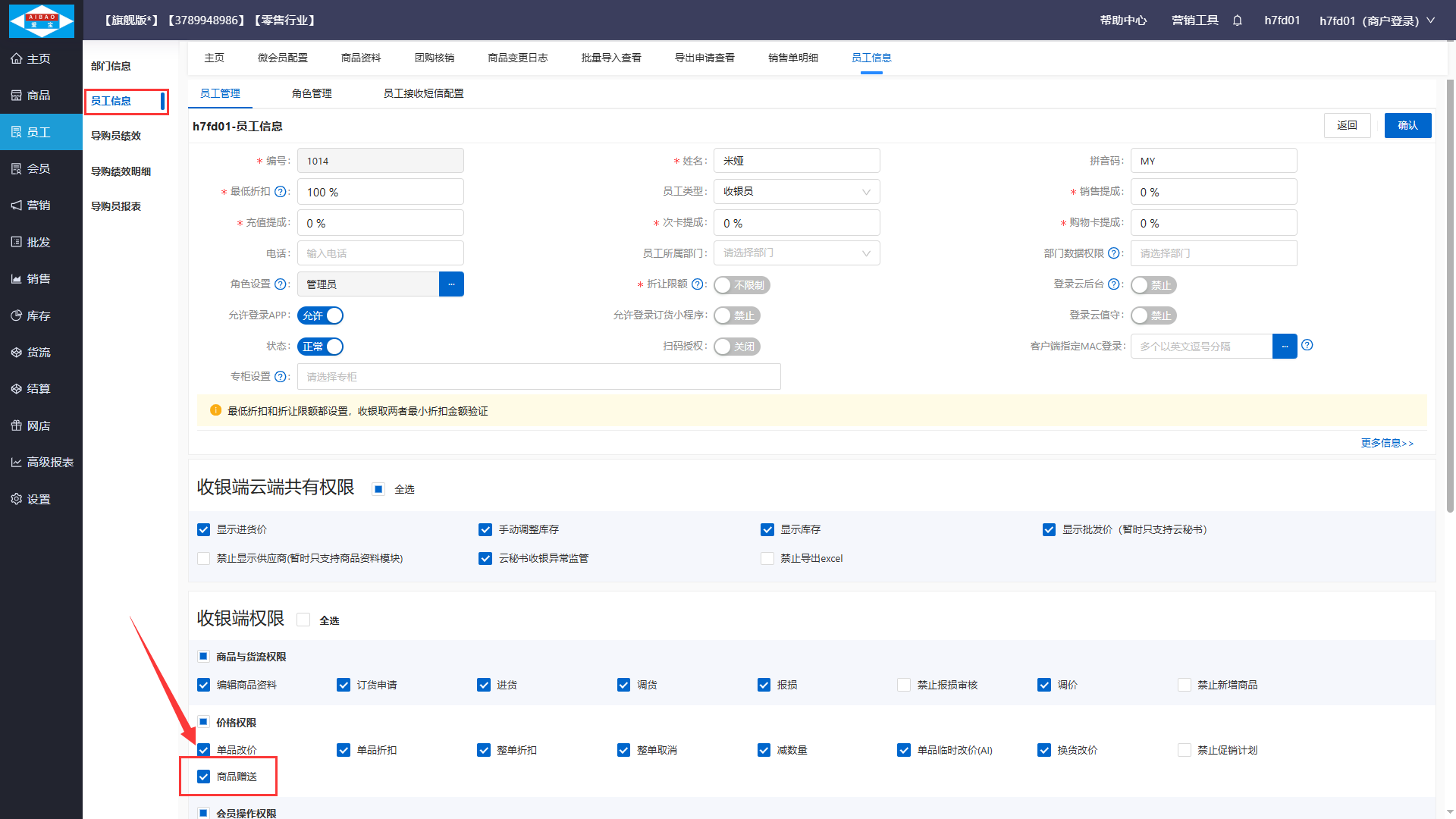 1、进入员工-员工信息菜单,编辑员工资料,打开商品赠送权限。